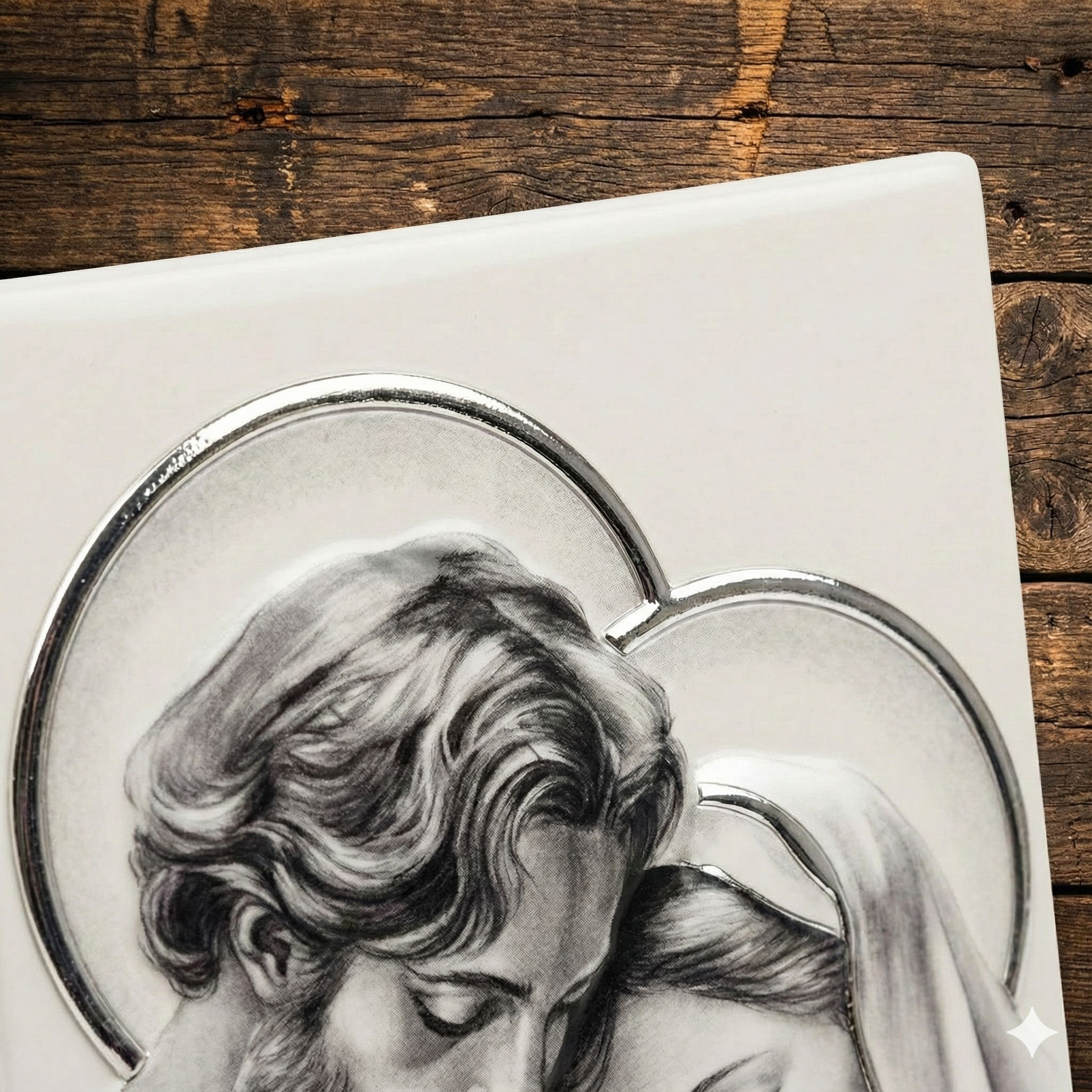 Obraz sakralny ICONIC™ – Święta Rodzina „Srebrne Aureole” to wyjątkowy wizerunek przedstawiający Maryję, Józefa i Dzieciątko Jezus w subtelnej, pełnej pokoju kompozycji. To obraz, który niesie przesłanie miłości, bezpieczeństwa i Bożej obecności w codzienności. Wzruszająca scena opieki i czułości sprawia, że doskonale nadaje się jako pamiątka Chrztu Świętego, prezent z okazji Komunii, Sakramentu Małżeństwa lub jako duchowa dekoracja domu.