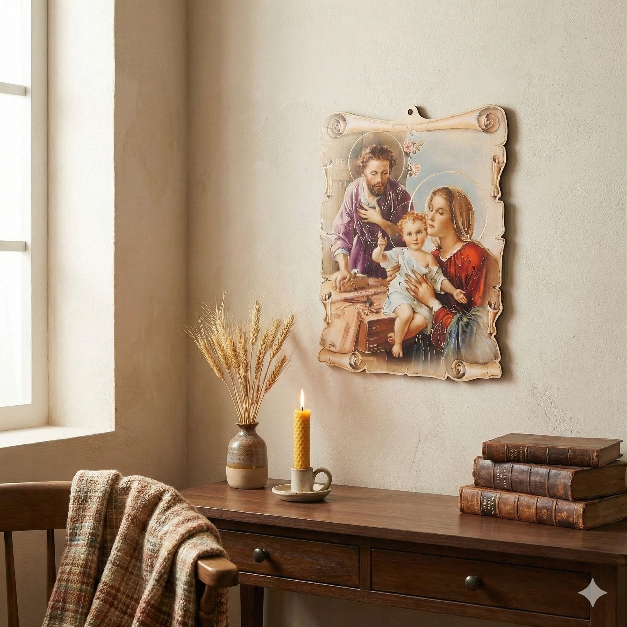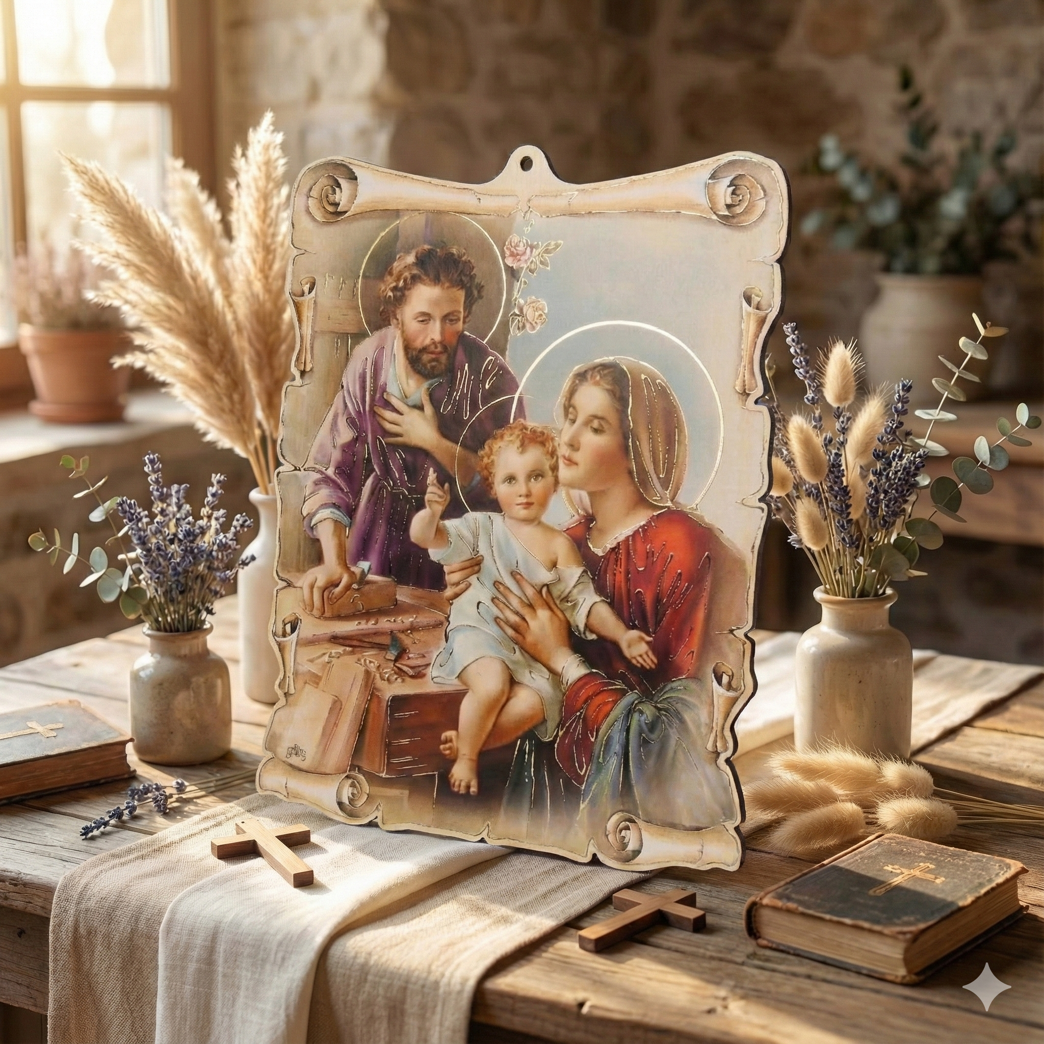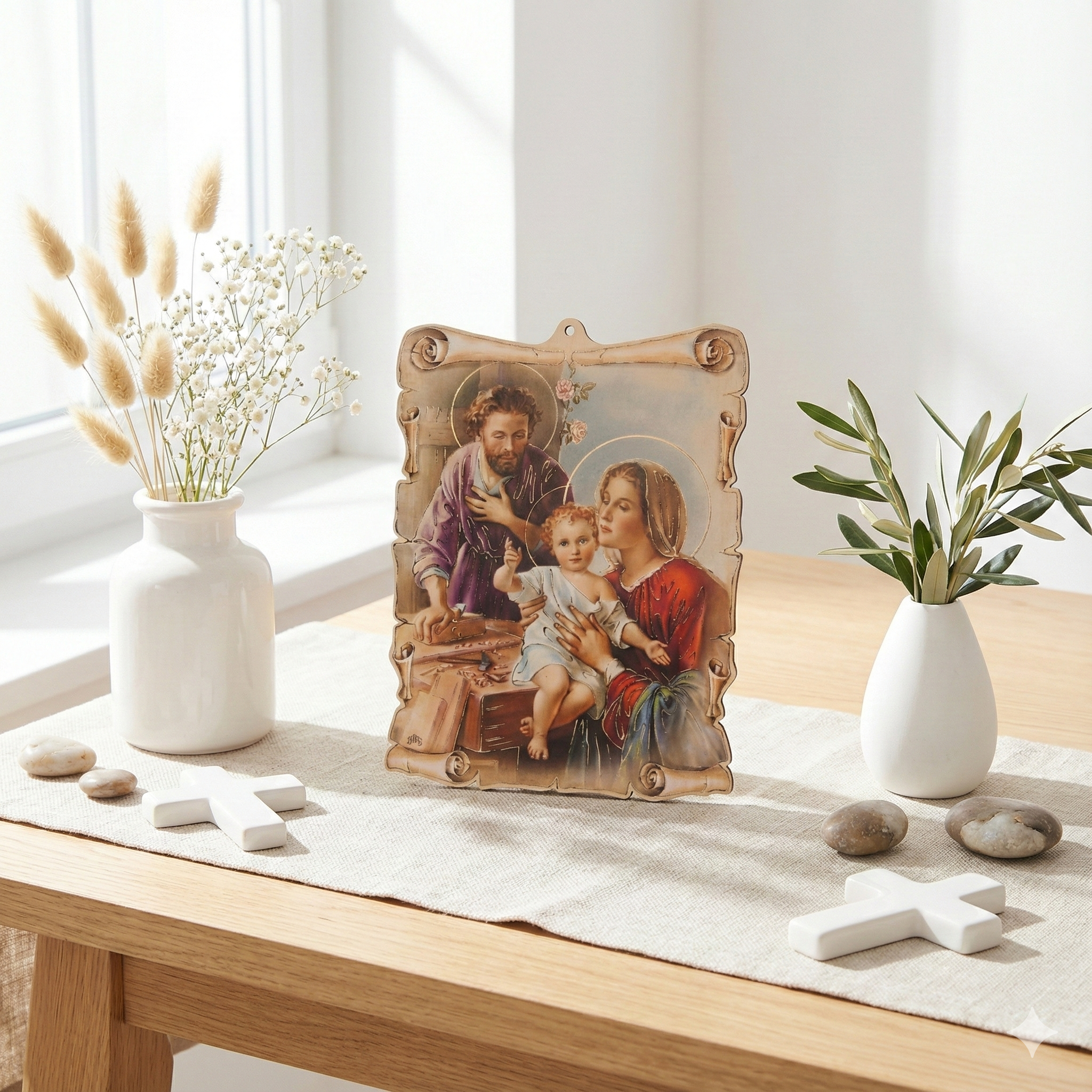 W teologii chrześcijańskiej Święta Rodzina stanowi wzór dla wszystkich rodzin – pokazuje, że codzienne życie, praca i wychowanie dziecka mogą stać się drogą do świętości. Pastelowa forma obrazu podkreśla łagodność, pokój i ciepło rodzinnego ogniska, czyniąc go wyjątkową pamiątką sakramentalną.