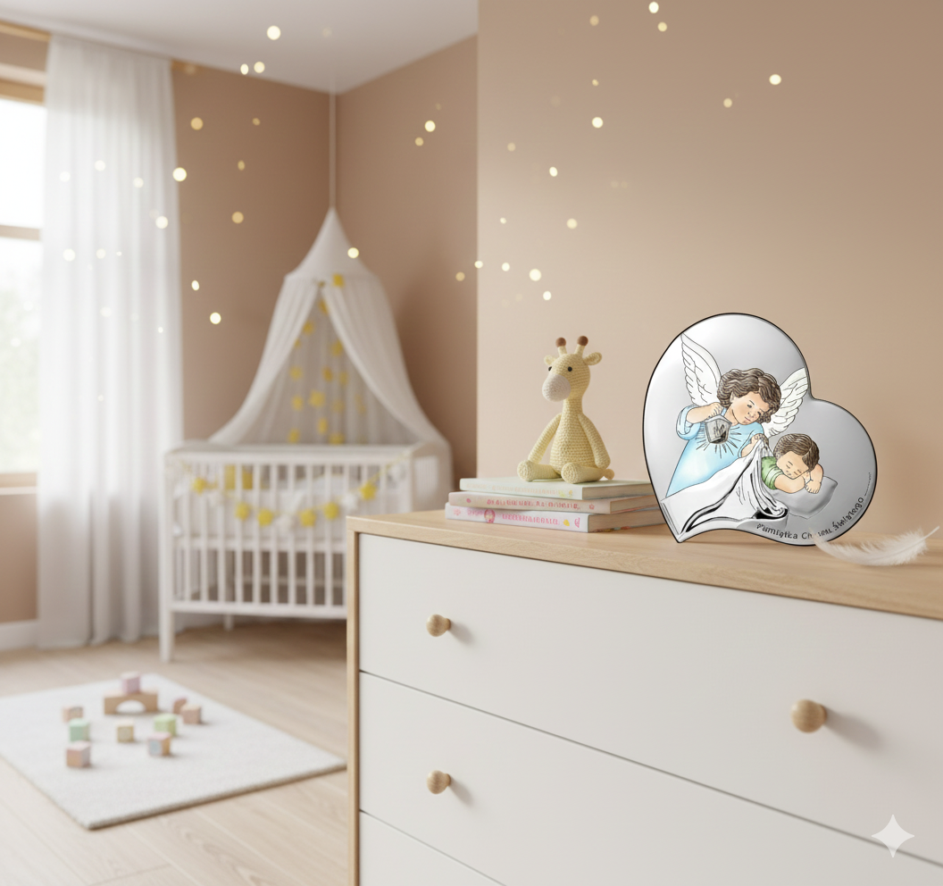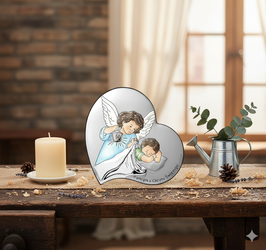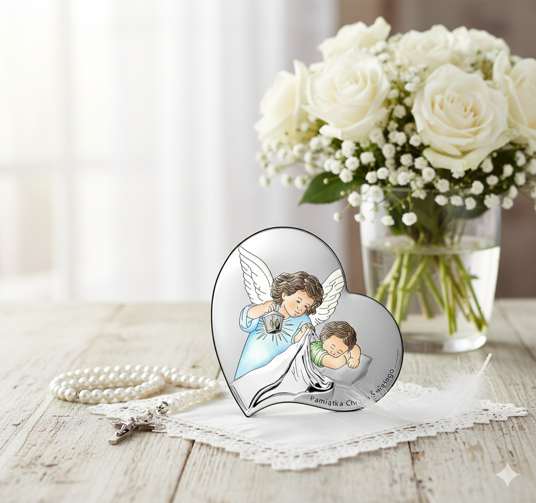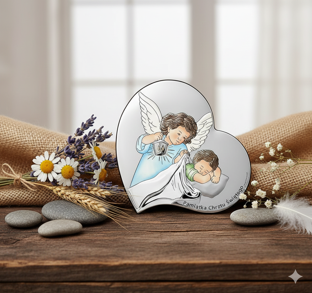 Obrazek srebrny w kształcie serduszka 13×13 cm z kolekcji SILVER BAPTISM™ to wyjątkowa pamiątka Chrztu Świętego dla chłopca. Subtelna błękitna kolorystyka i klasyczna scena Anioła Stróża otulającego dziecko symbolizują bezpieczeństwo, czystość i Bożą opiekę od pierwszych chwil życia.