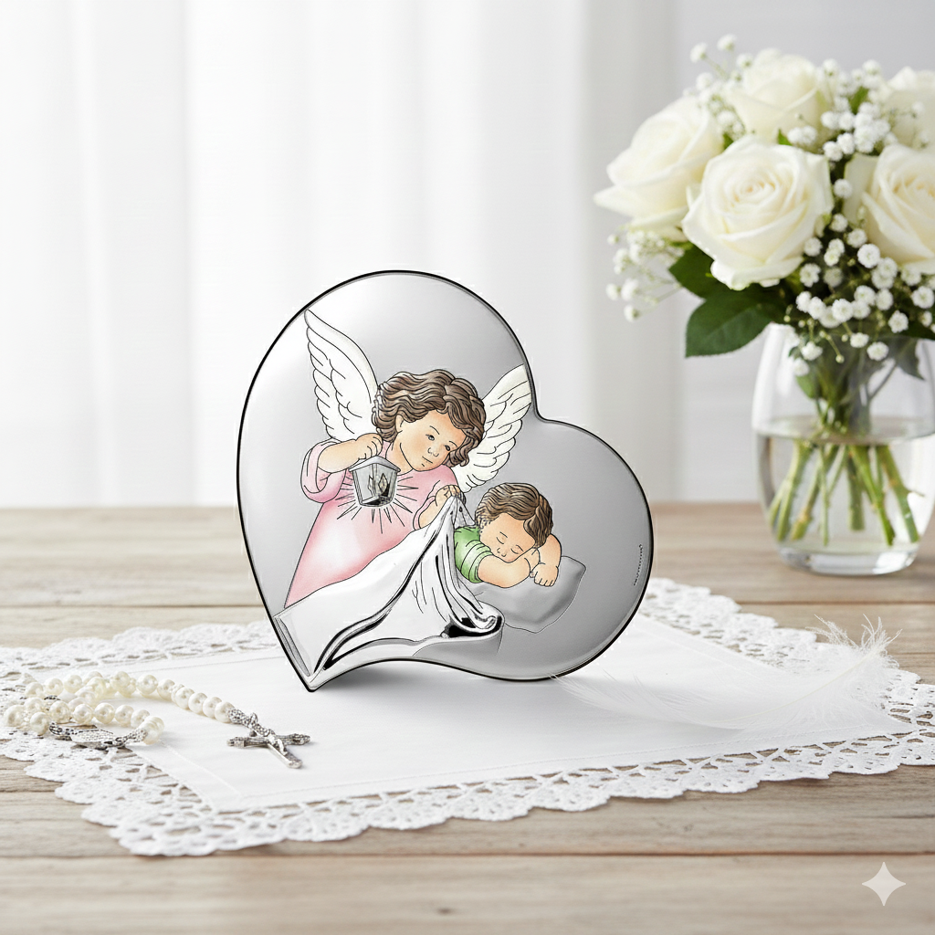 Srebrny obrazek MIRO-SILVER® w kształcie serduszka, przedstawiający Anioła Stróża czuwającego nad dzieckiem. Idealna pamiątka Chrztu Świętego dla dziewczynki. Włoska produkcja, piękne kolory i możliwość dodania graweru laserowego.