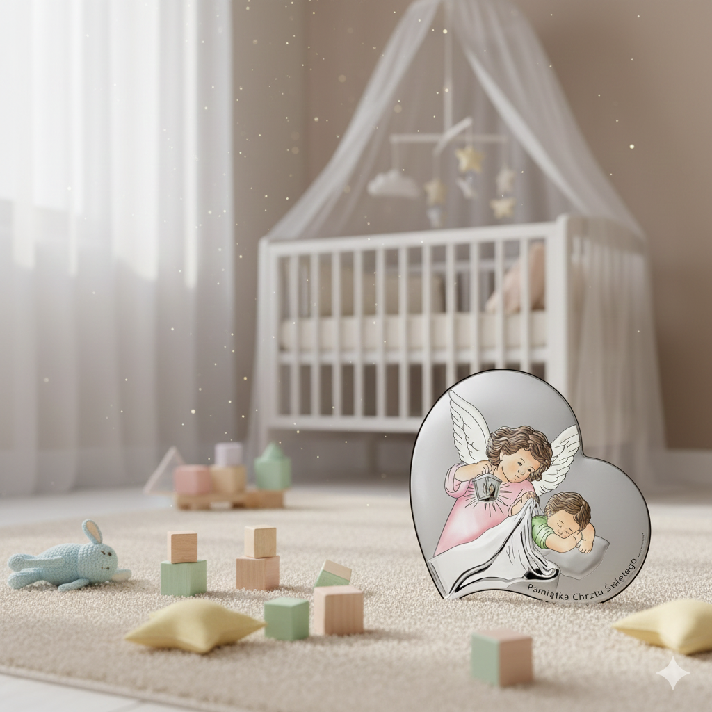 Obrazek srebrny w kształcie serduszka 13×13 cm z kolekcji SILVER BAPTISM™ to wyjątkowa pamiątka Chrztu Świętego dla dziewczynki. Delikatna różowa kolorystyka i pełna czułości scena Anioła Stróża otulającego dziecko białą kołderką symbolizują bezpieczeństwo, Bożą opiekę i troskę, która będzie towarzyszyć maluszkowi przez całe życie.