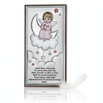 Srebrny obrazek MIRO-SILVER® z uroczym aniołkiem na chmurce, w delikatnej różowej kolorystyce. Idealna pamiątka Chrztu Świętego dla dziewczynki – możliwość personalizacji grawerem lub nadrukiem UV. Włoska produkcja, wysoka trwałość i subtelny, dziecięcy urok.