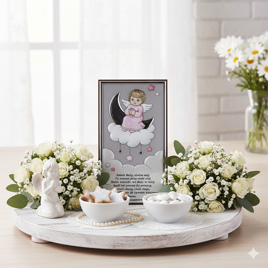 Taki obrazek pięknie dopełni wystrój dziecięcego pokoju, kącika modlitwy lub rodzinnej galerii pamiątek, przypominając o dniu, w którym dziecko zostało włączone do wspólnoty Kościoła.
