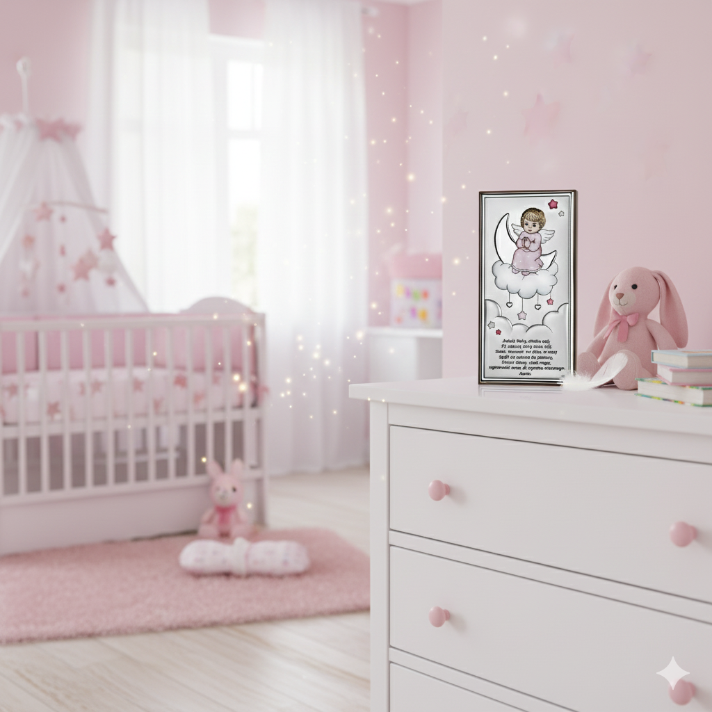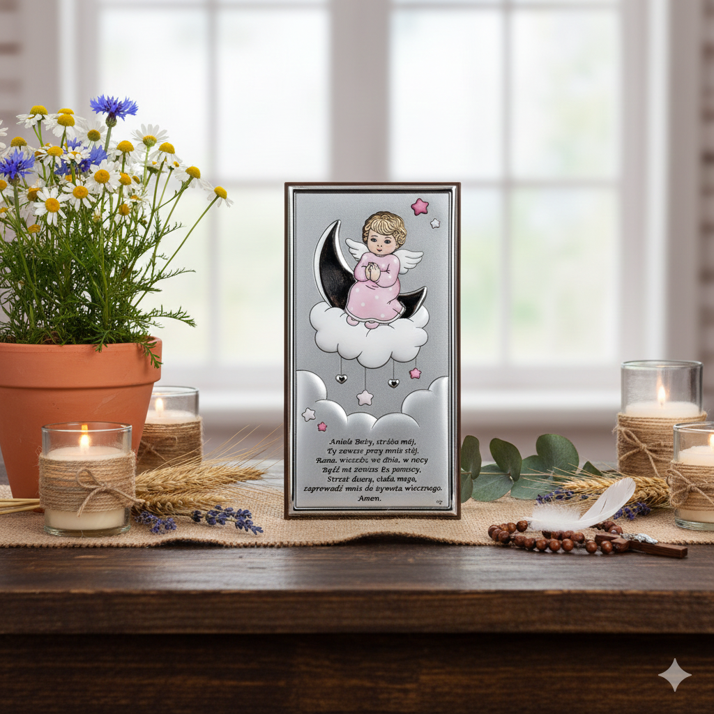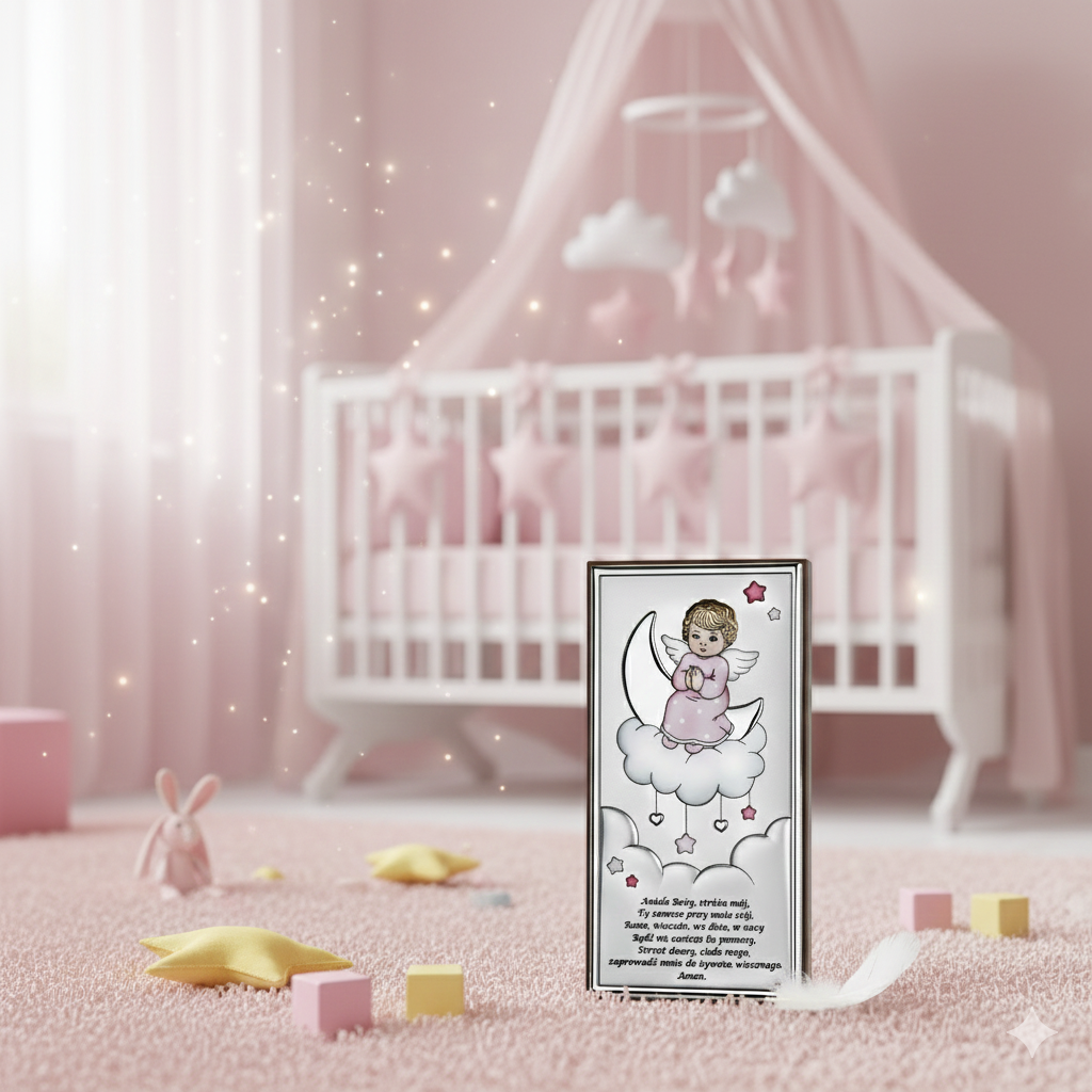 Obrazek srebrny „Aniołek na chmurce” 8×15 cm z kolekcji SILVER BAPTISM™ to subtelna i pełna czułości pamiątka Chrztu Świętego dla dziewczynki. Uroczy aniołek spoczywający na chmurce, otoczony pastelowymi różowymi akcentami, symbolizuje opiekę, łagodność i Boże błogosławieństwo nad dzieckiem.
