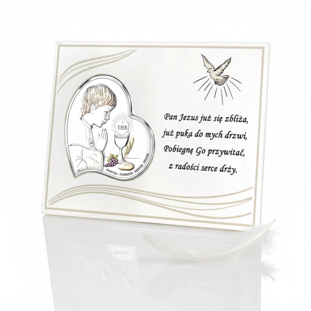 Elegancki obrazek srebrny MIRO-SILVER® z motywem Pierwszej Komunii Świętej w wariancie chłopięcym. Umieszczony na panelu z możliwością postawienia lub powieszenia. Idealna pamiątka komunijna z personalizacją: grawer laserowy lub nadruk UV. Włoska produkcja VALENTI – najwyższa jakość i duchowy wymiar.