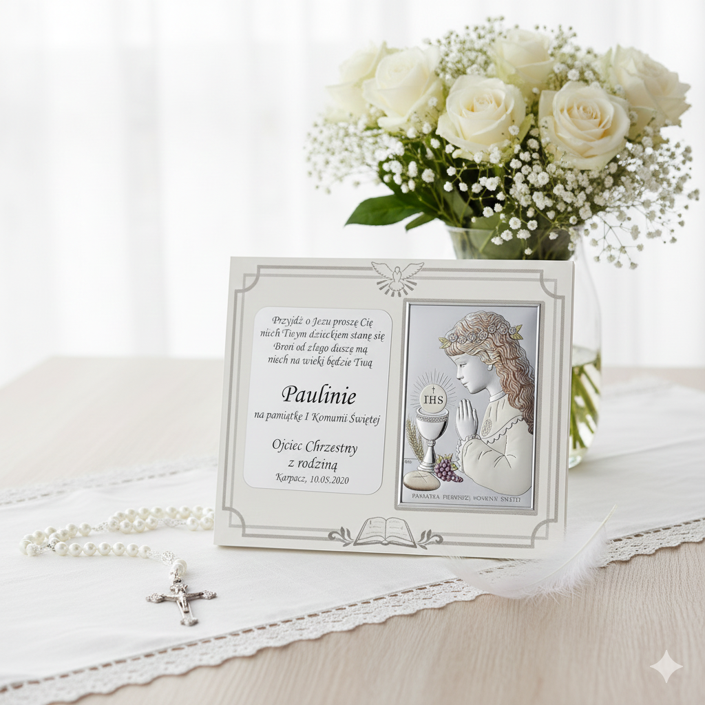 Zobacz inne eleganckie srebrne obrazki komunijne dla dziewczynek i chłopców.