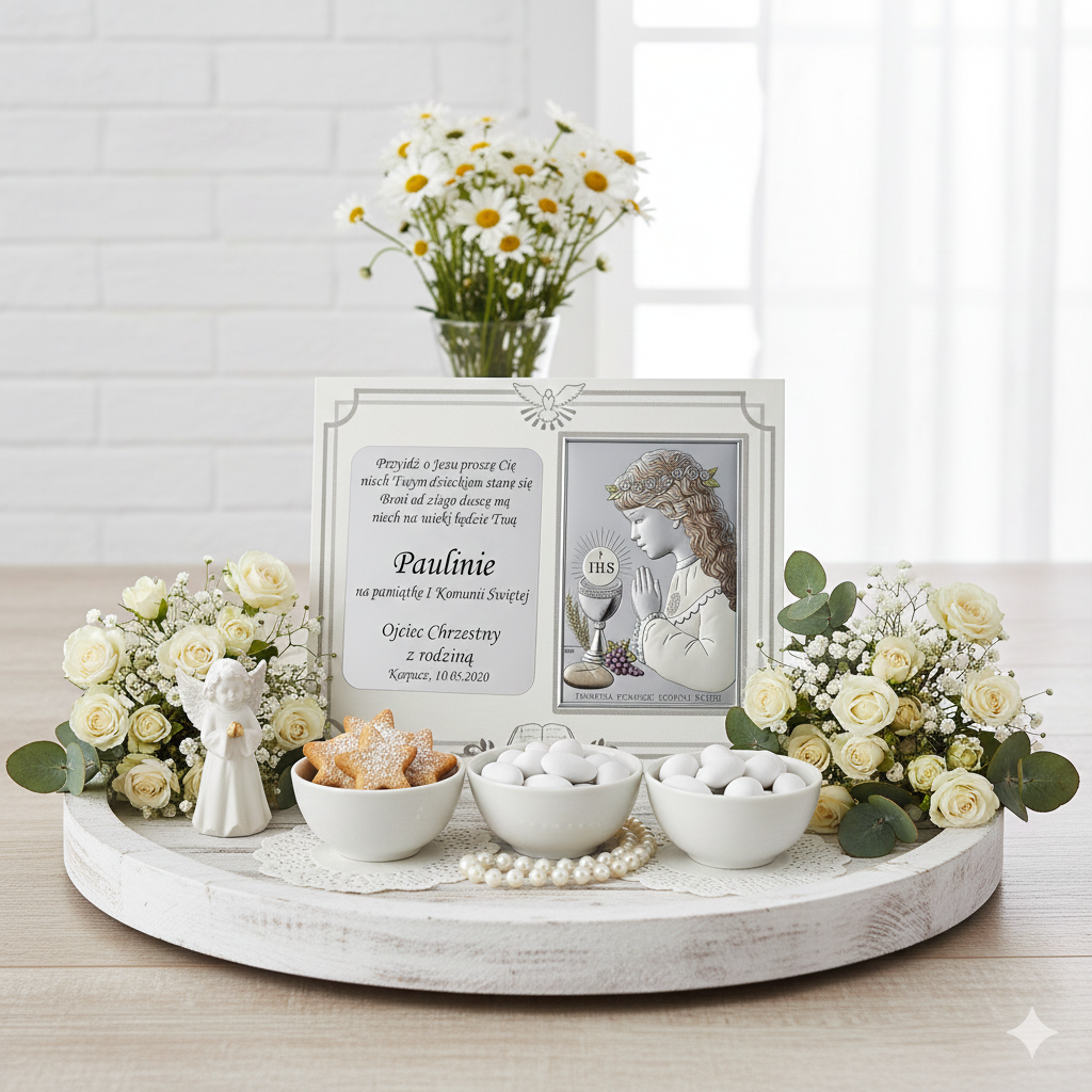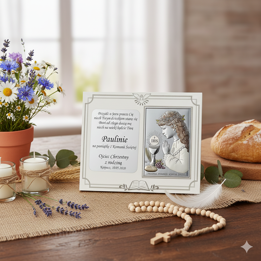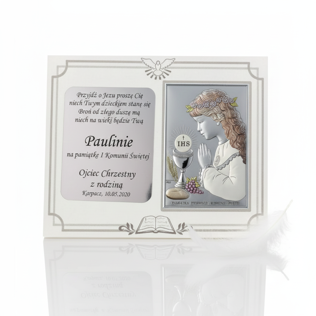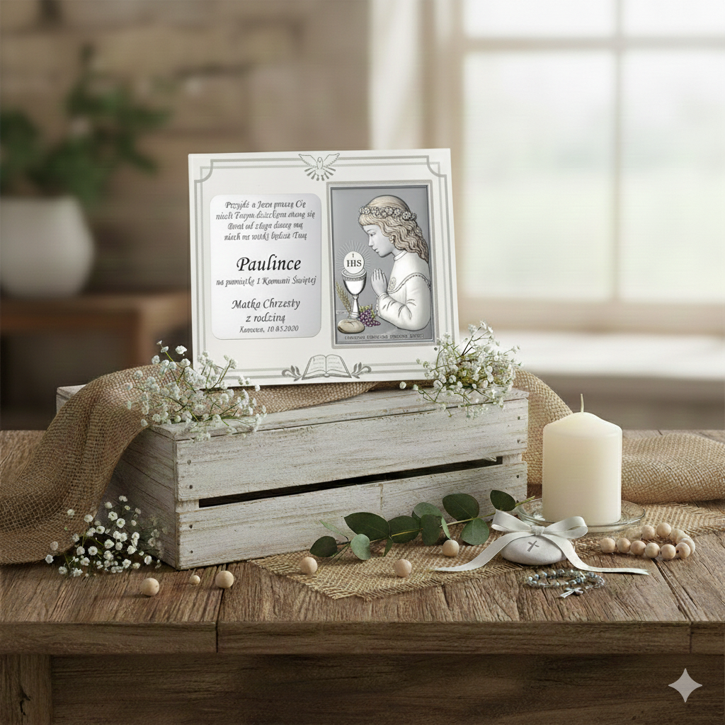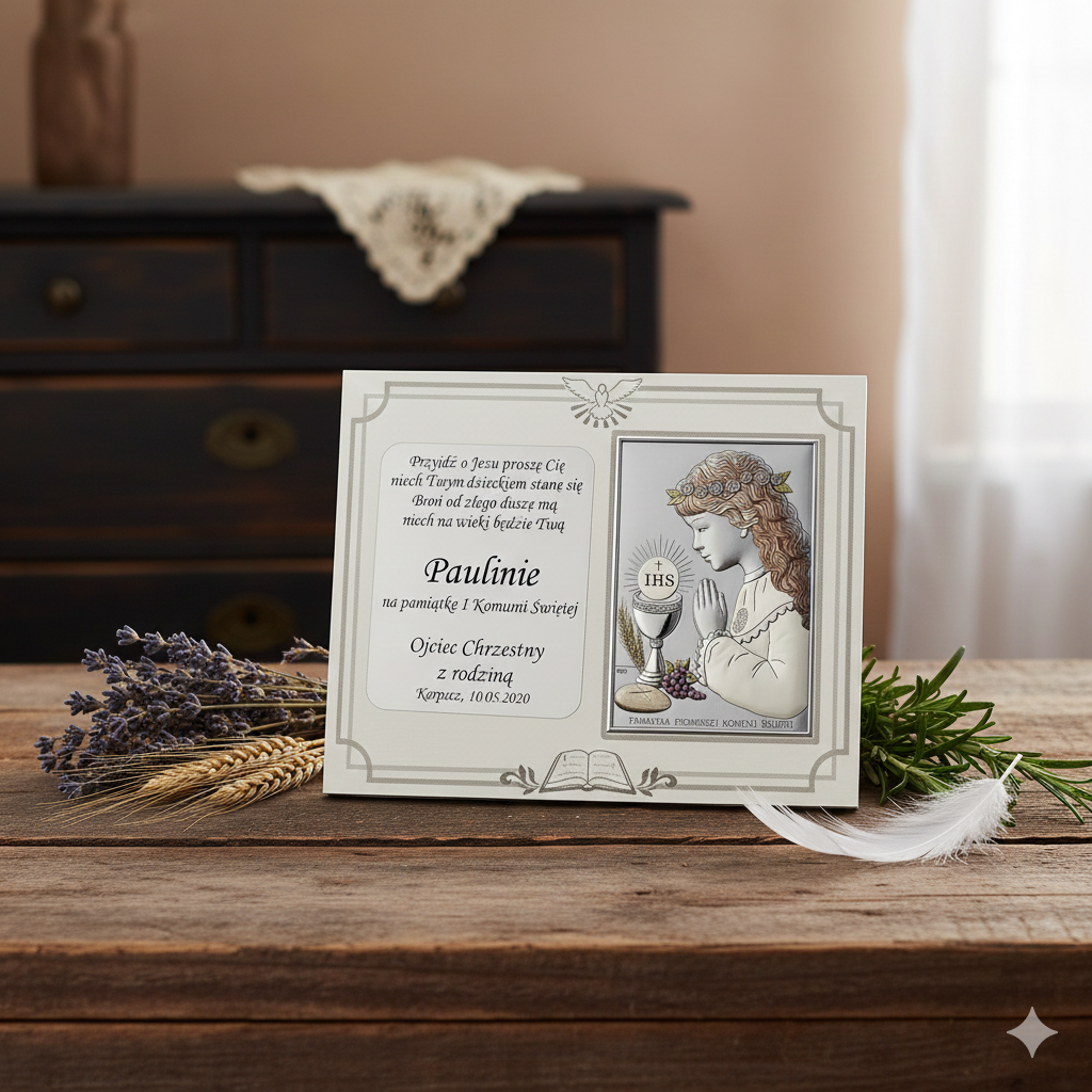 W zestawie znajduje się grawer laserowy wykonany na eleganckiej tabliczce umieszczonej na rewersie obrazka. Pozwala to dodać imię dziewczynki, datę Komunii oraz dedykację od serca, tworząc pamiątkę przechowywaną przez długie lata.