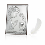 Srebrny obrazek MIRO-SILVER® z motywem IHS i modlącą się dziewczynką. Idealna pamiątka Pierwszej Komunii Świętej, wykonana we Włoszech, z możliwością personalizacji grawerem lub nadrukiem UV. W zestawie stojak i otwór do powieszenia.