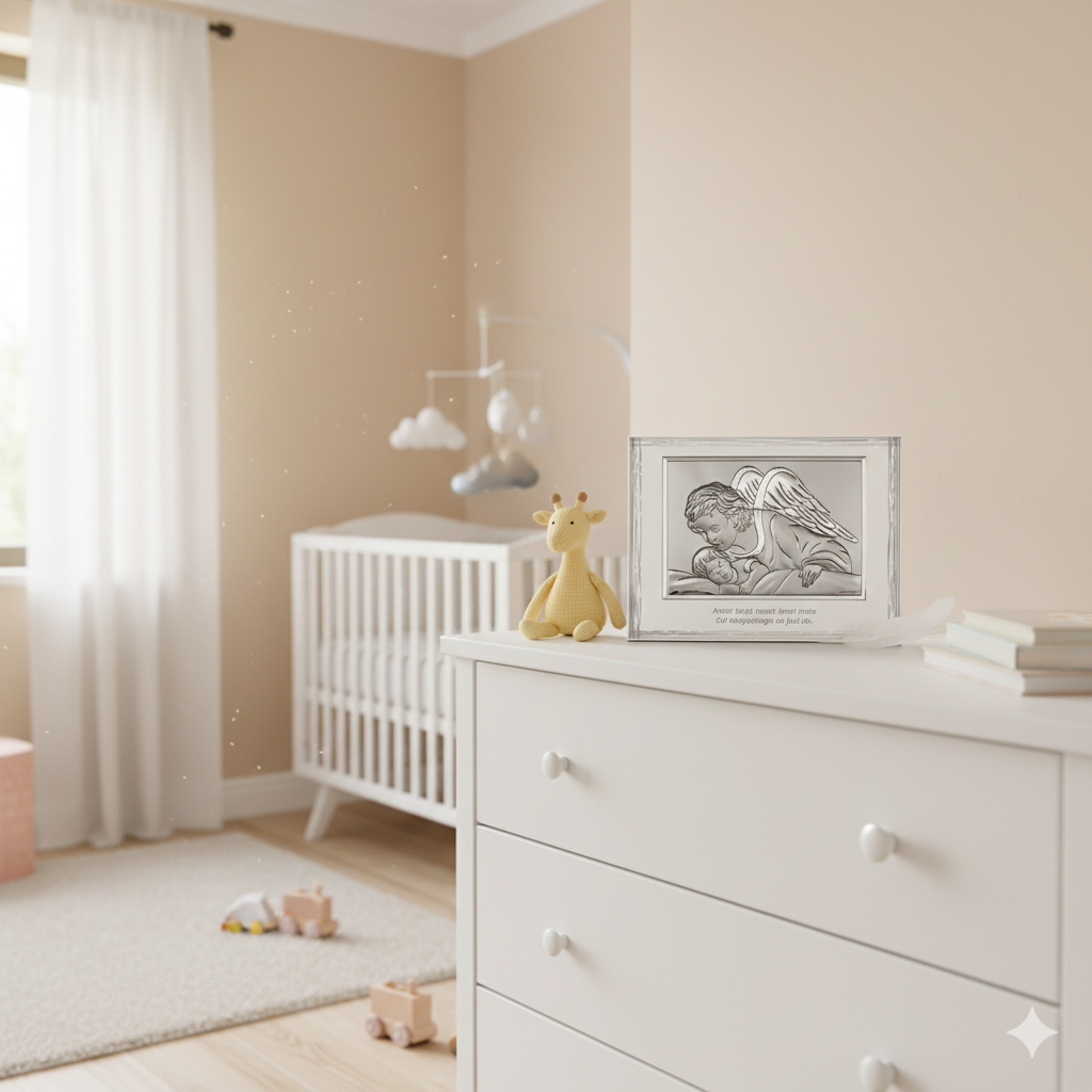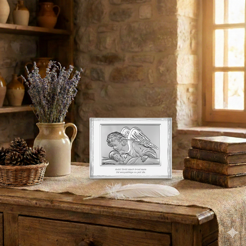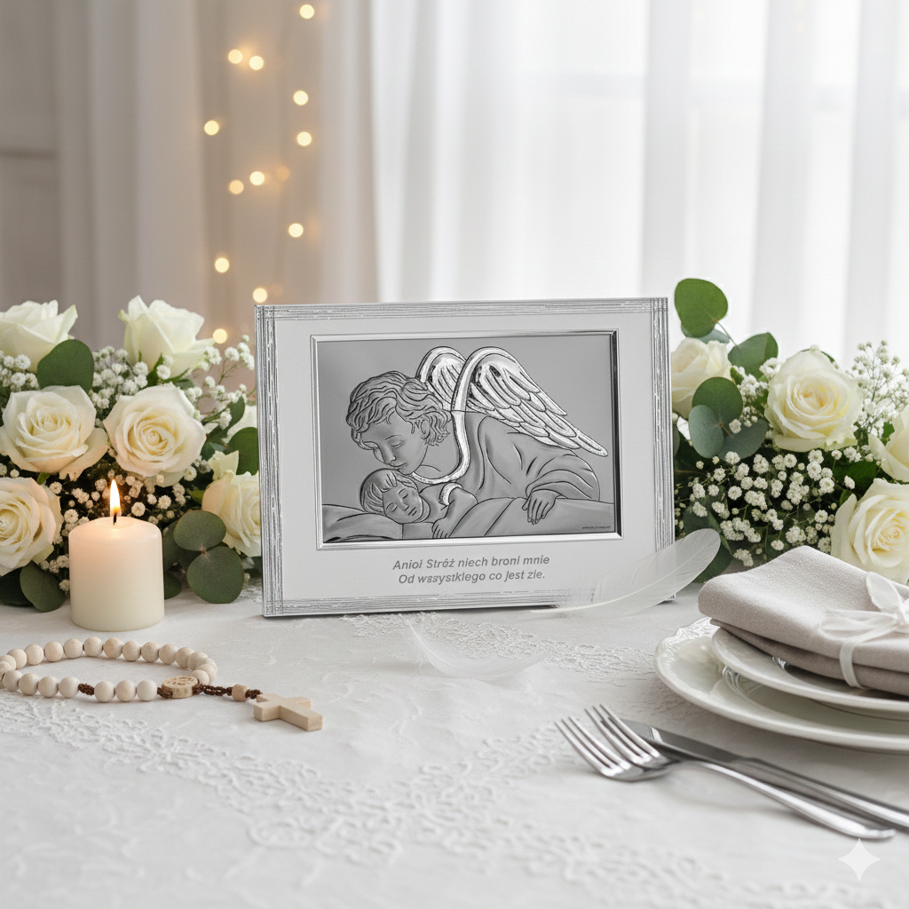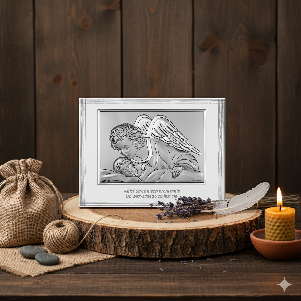 Motyw Anioła Stróża jest od wieków obecny w tradycji chrześcijańskiej jako symbol bezpieczeństwa, miłości i nieustannej ochrony. To pamiątka, która będzie towarzyszyć dziecku przez lata i nabierać wartości sentymentalnej.