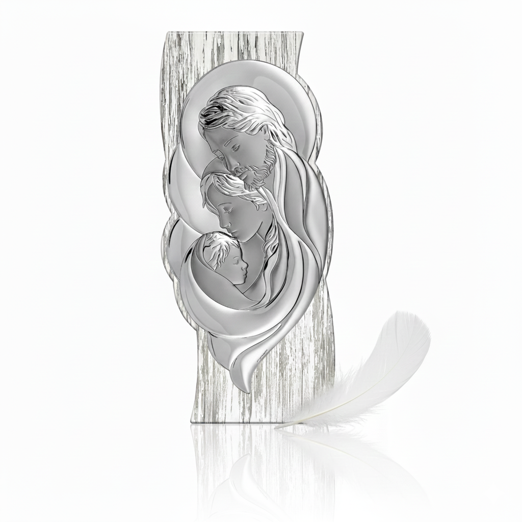 Srebrny obrazek „Święta Rodzina na drewnie Shabby Chic” z kolekcji SILVER SHABBY™ to połączenie duchowej głębi z romantyczną estetyką shabby – subtelnymi przetarciami, jasnym drewnem i miękką, pastelową kolorystyką. Wizerunek Maryi, Józefa i Dzieciątka symbolizuje miłość, jedność oraz opiekę nad domem. To ponadczasowa pamiątka sakramentalna, która towarzyszy rodzinie przez całe życie.