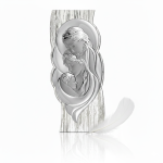 Elegancki obrazek srebrny z MIRO-SILVER® 999,95, przedstawiający Świętą Rodzinę na dekoracyjnym drewnie w stylu Shabby Chic. Wykonany we Włoszech, idealny na Chrzest, Komunię, ślub lub jako prezent religijny. Dostępna personalizacja laserowa lub UV.