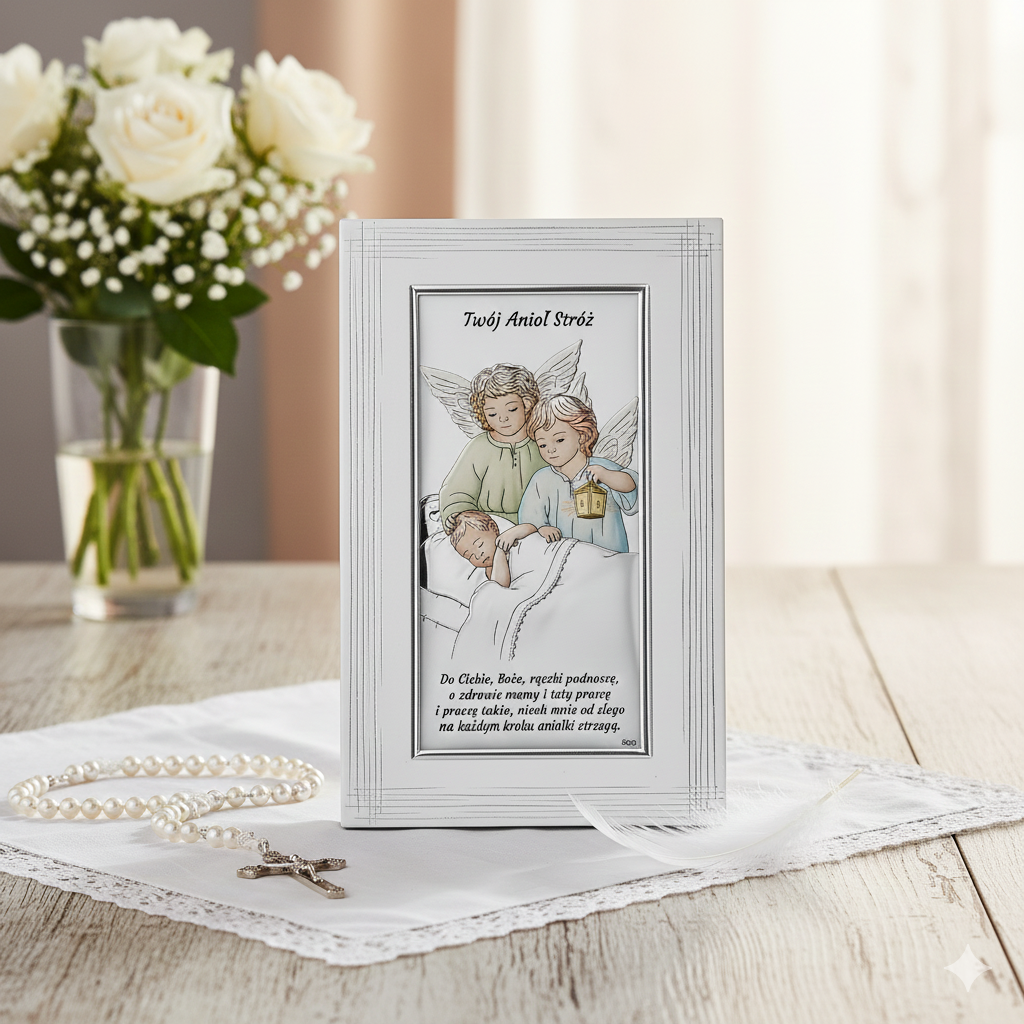Elegancki srebrny obrazek z wizerunkiem Anioła Stróża i modlitwą „Do Ciebie, Boże, rączki podnoszę…”. Wykonany z metalu MIRO-SILVER® pokrytego czystym srebrem 999,95 metodą PVD. Włoska jakość, opcja personalizacji grawerem lub nadrukiem UV. Idealny na Chrzest, Komunię i inne uroczystości.