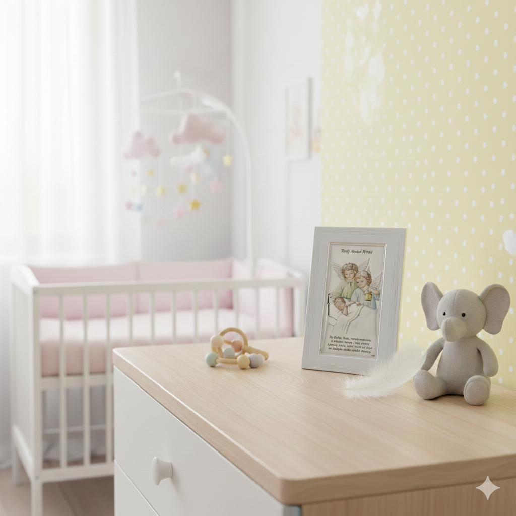 Dzięki modlitwie i wizerunkowi Anioła Stróża obrazek niesie duchową opiekę i błogosławieństwo — idealny do pokoju dziecka, sypialni lub domowego kącika modlitewnego.