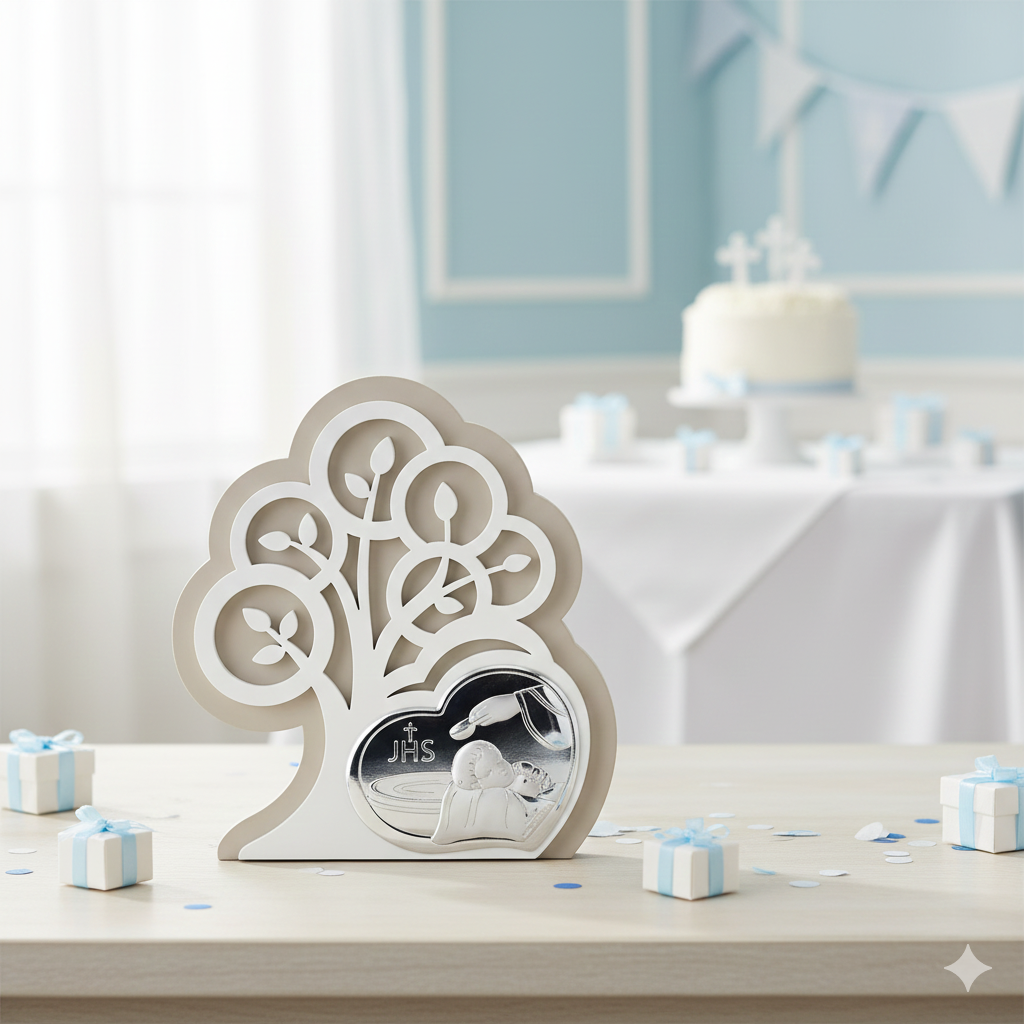 Elegancki srebrny obrazek z motywem Drzewa Życia — idealna pamiątka Chrztu Świętego. Wykonany we Włoszech z MIRO-SILVER®, dostępny z personalizacją (grawer lub nadruk). Symbol opieki, błogosławieństwa i Bożej miłości.