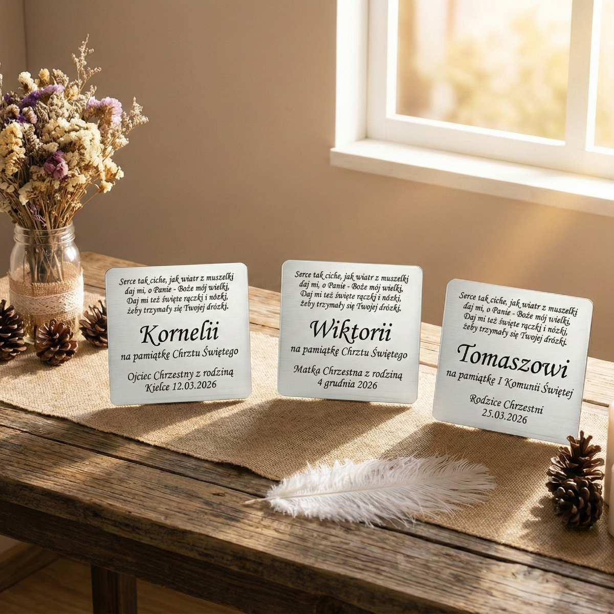 Obrazek można wzbogacić o grawer laserowy (na tabliczce) lub kolorowy nadruk Ink-Jet bezpośrednio na powierzchni, dzięki czemu staje się wyjątkowy i jedyny w swoim rodzaju. Idealny sposób, by dodać imię dziecka, datę Chrztu Świętego lub krótką dedykację.