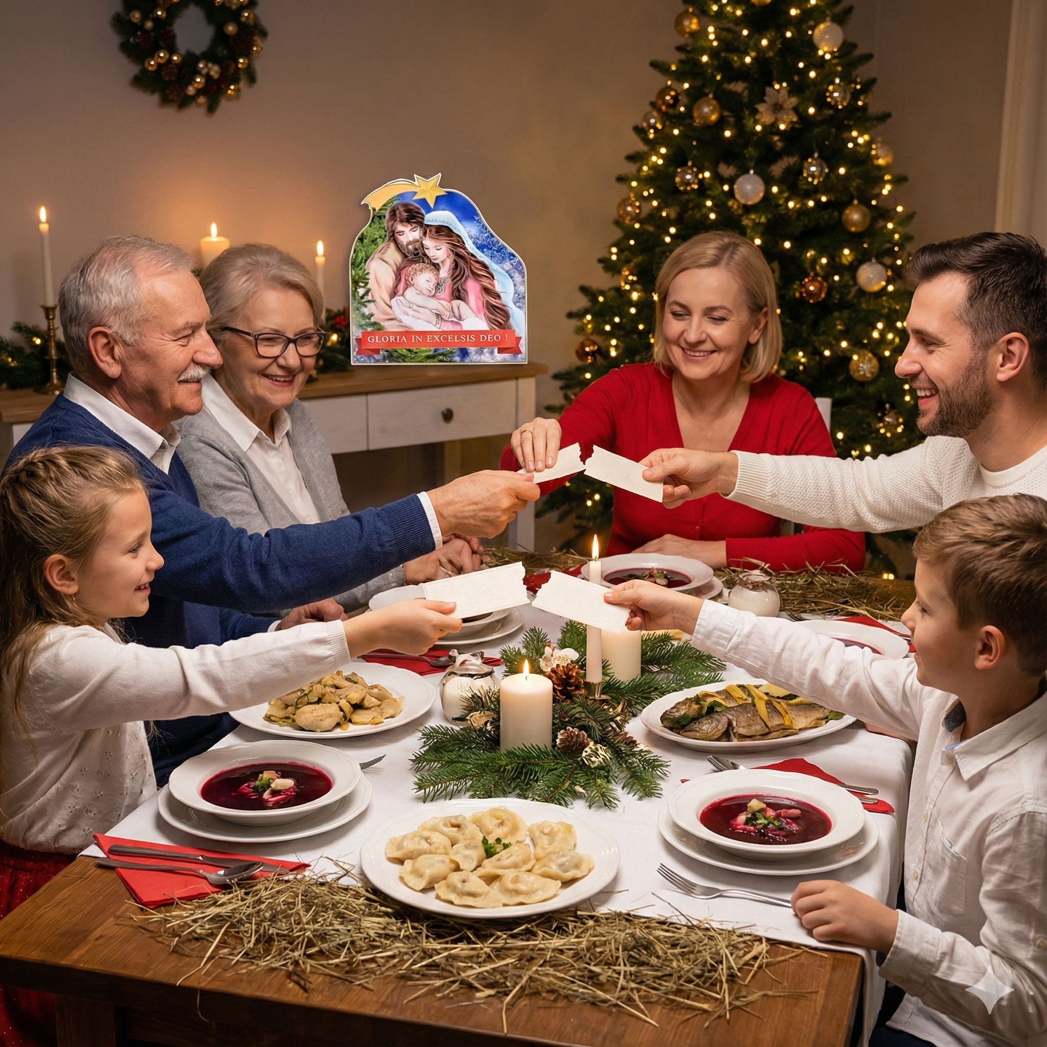 Prezentacja klasycznego opłatka wigilijnego – ponadczasowego symbolu pojednania, miłości i rodzinnej wspólnoty, obecnego przy wigilijnym stole.