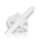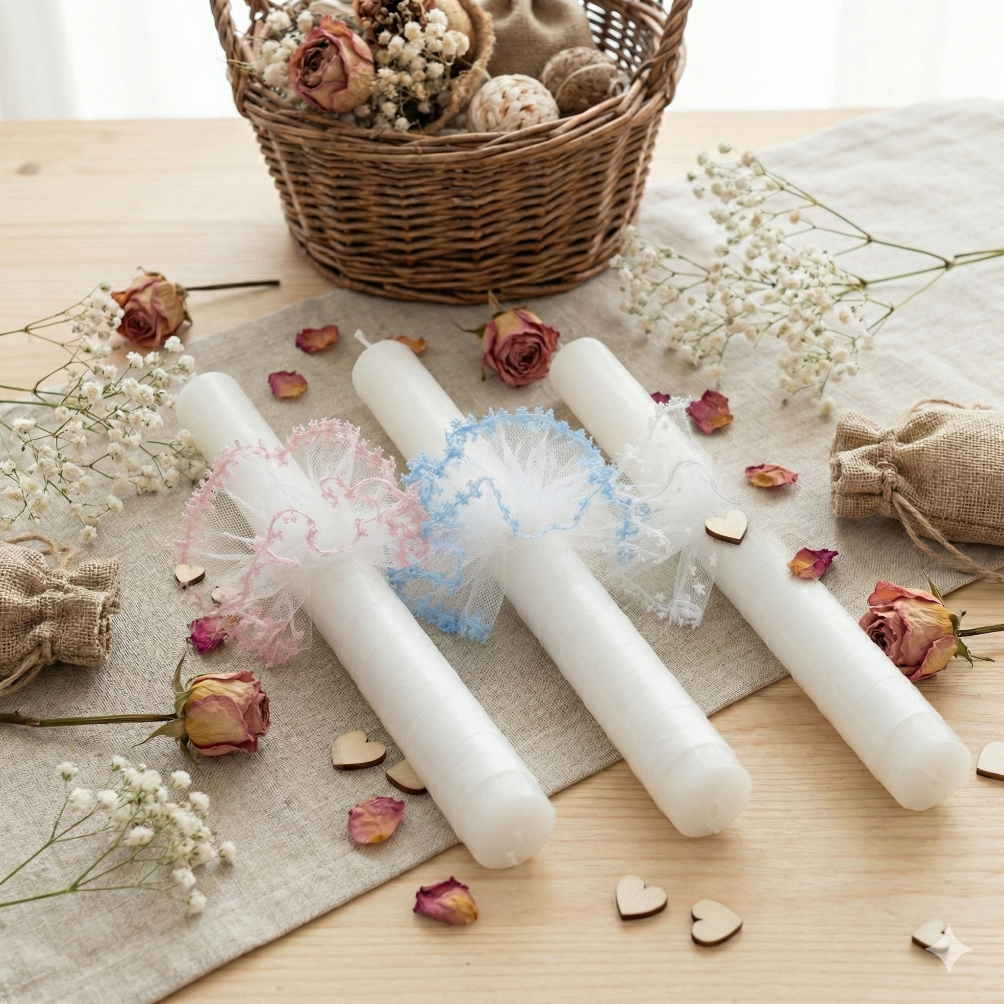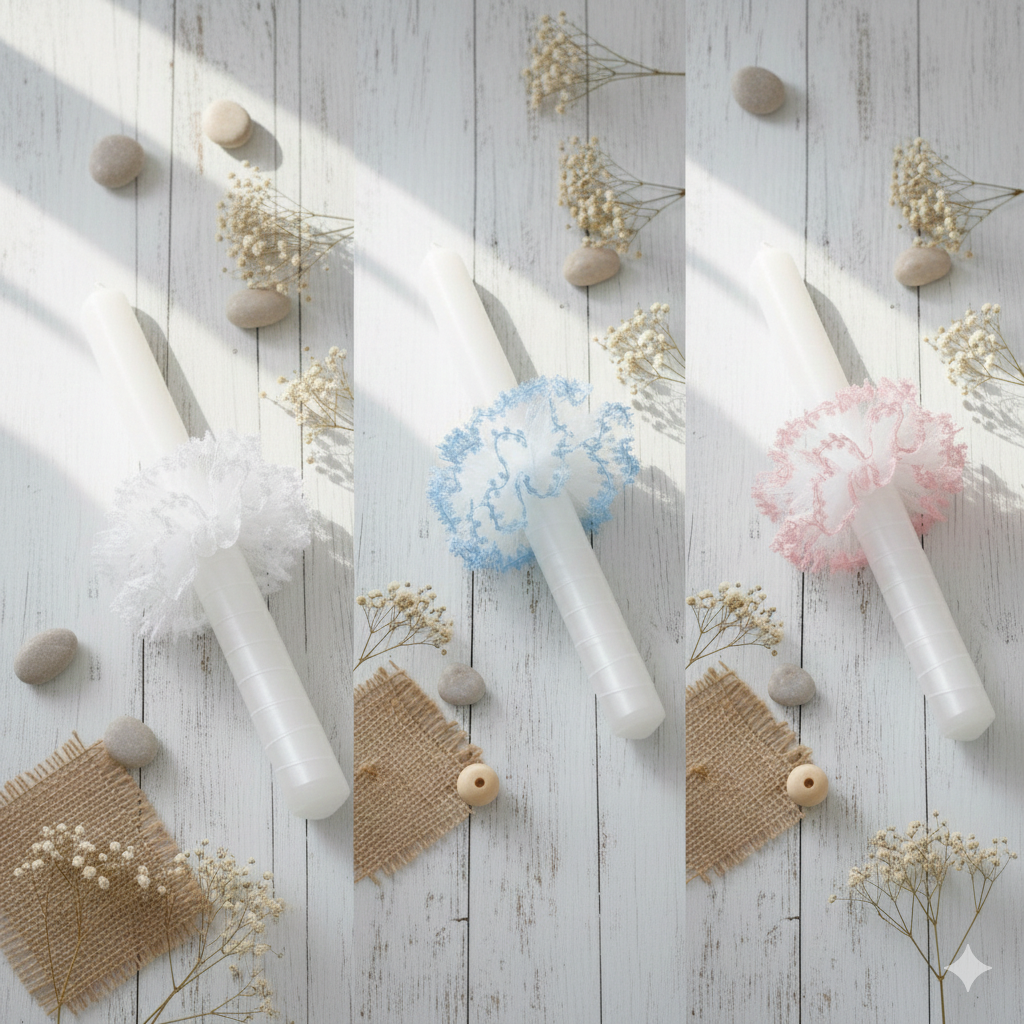 Dekoracyjna osłonka – stroik na świecę gromniczną, idealna na Chrzest Święty, Pierwszą Komunię lub inne uroczystości religijne. Wykonana z delikatnych, ozdobnych materiałów, pięknie komponuje się z każdą świecą. Dostępna w różnych kolorach: różowym, błękitnym, białym, złotym i srebrnym.