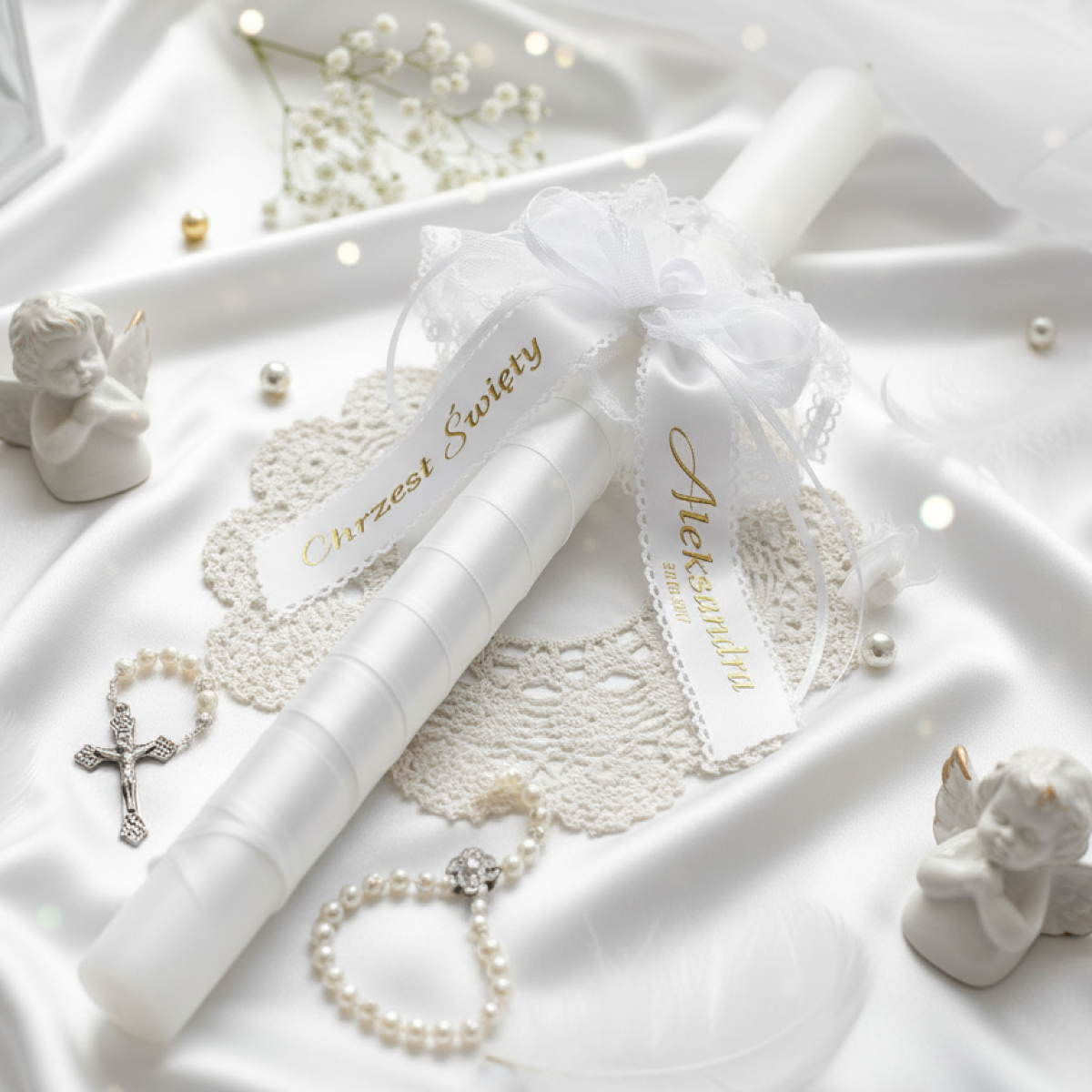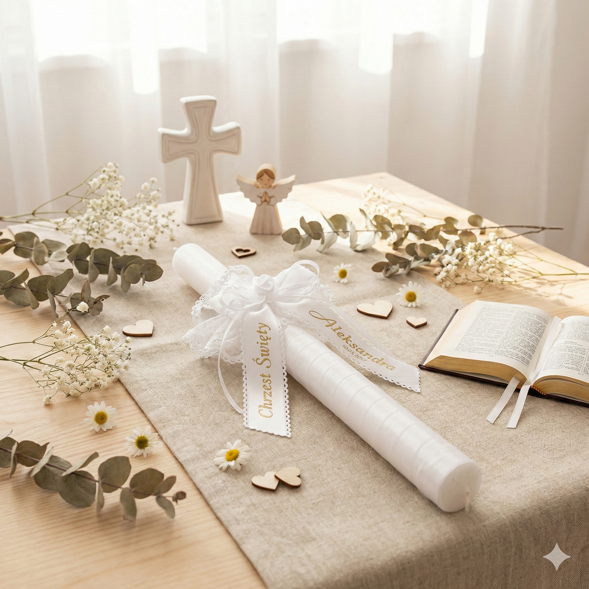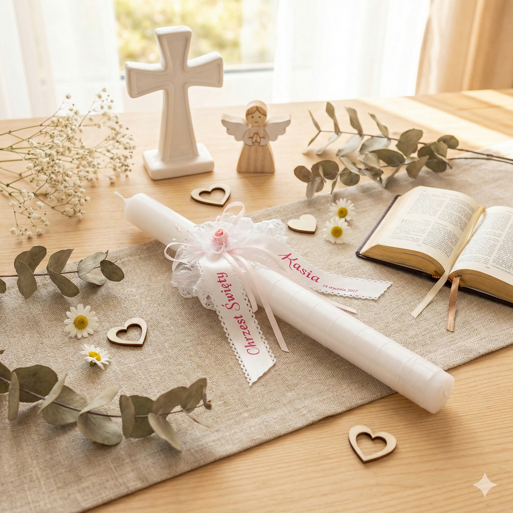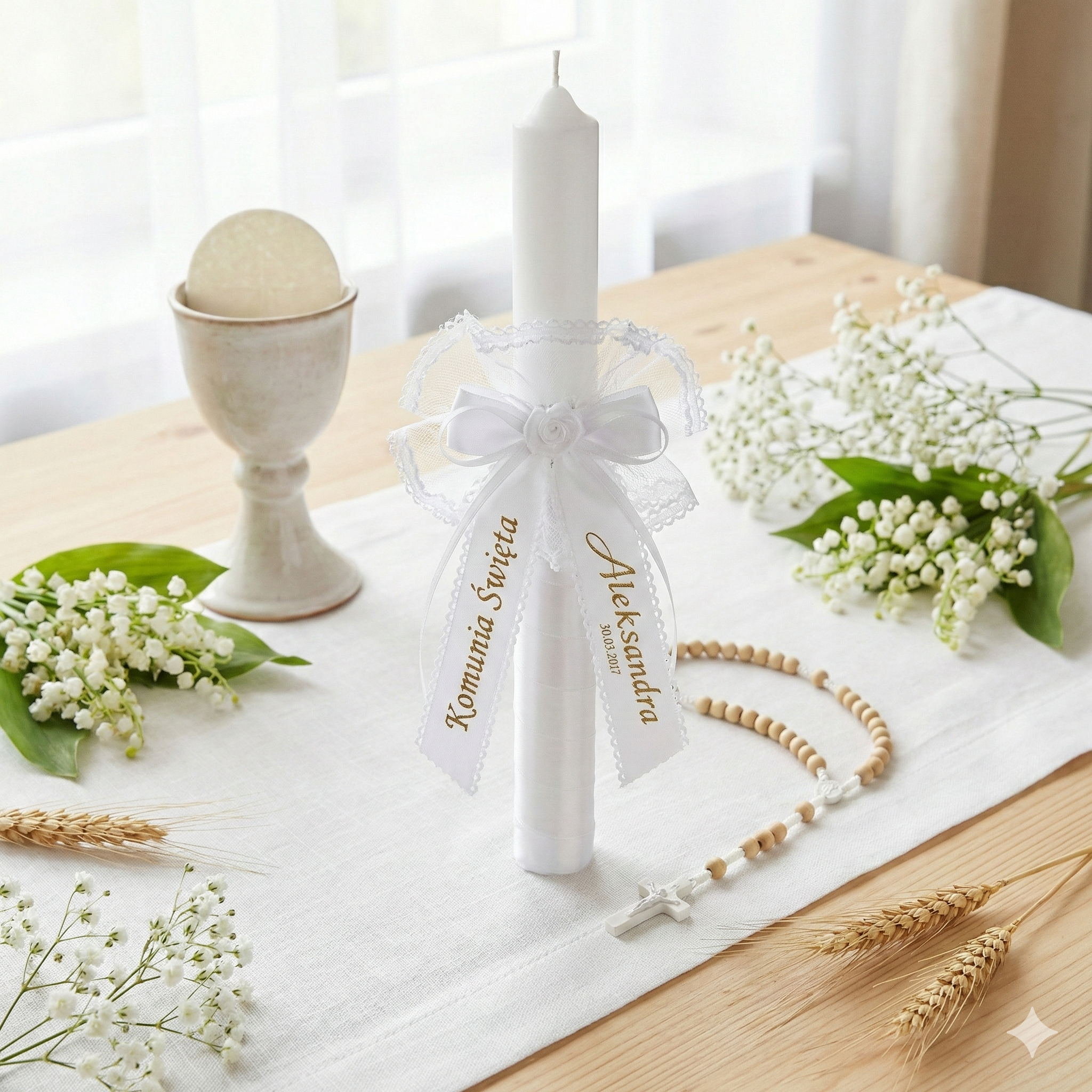 Świeca to jeden z najważniejszych symboli sakramentalnych – oznacza światło wiary, czystość i obecność Boga. Ozdoba na świecę z imieniem dziecka to piękny sposób, by nadać jej indywidualny i pamiątkowy charakter. Stroik z imieniem i datą uroczystości stanowi elegancki detal, który podkreśla wyjątkowość dnia Chrztu Świętego lub Pierwszej Komunii Świętej.