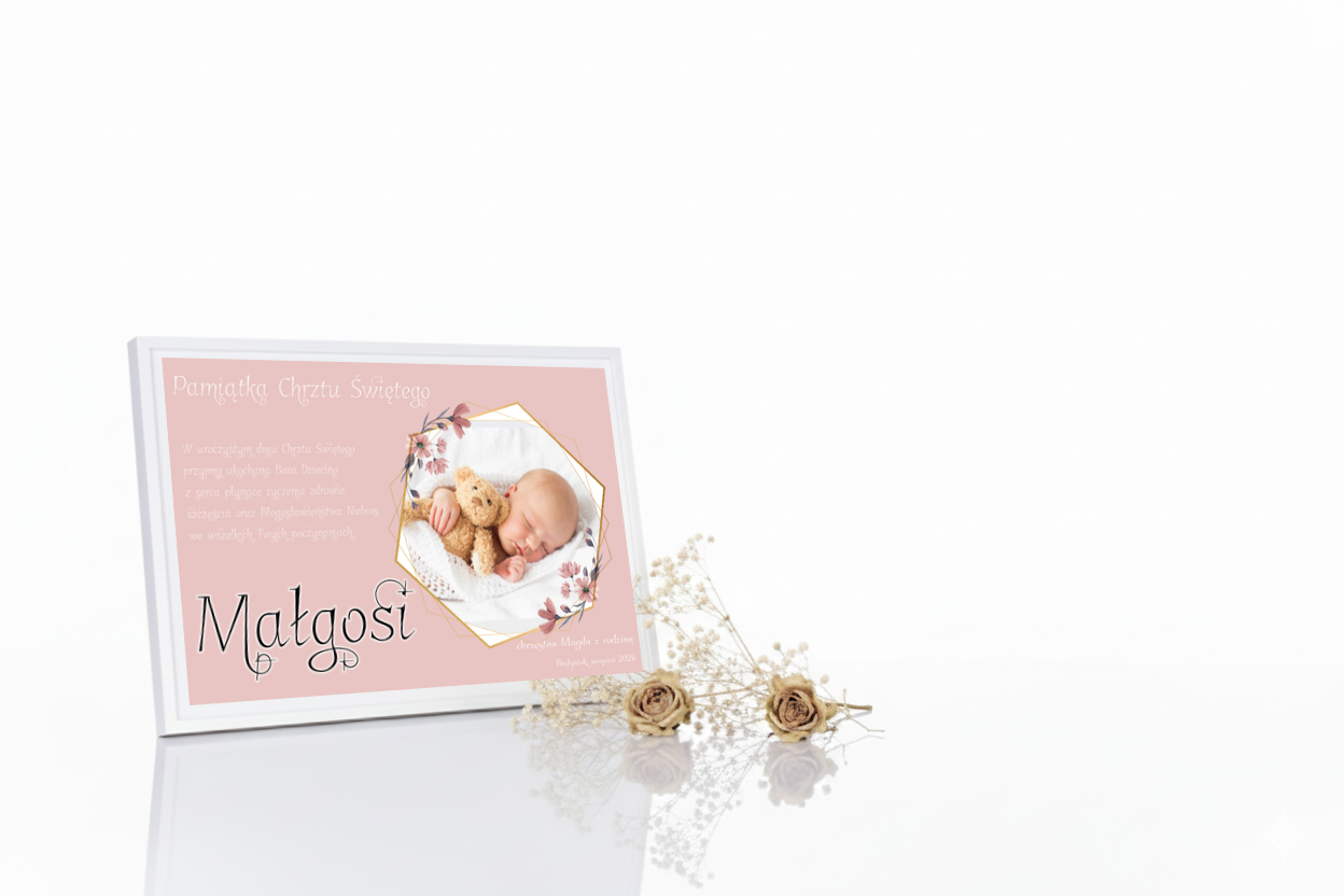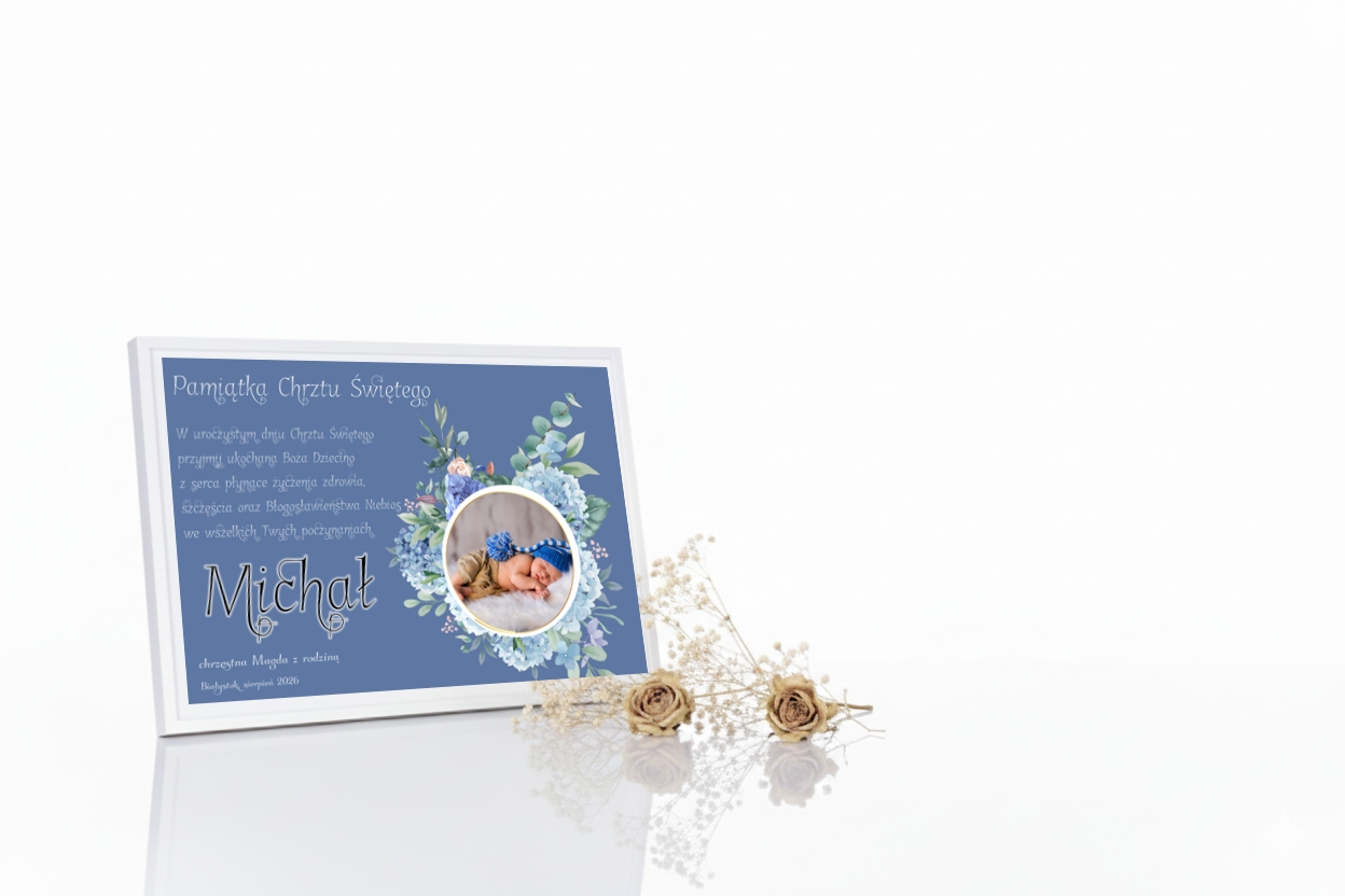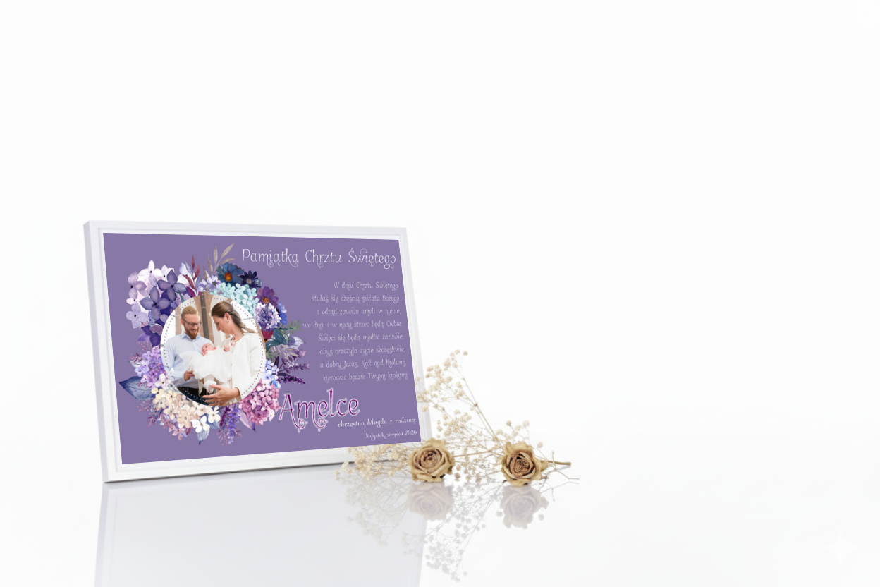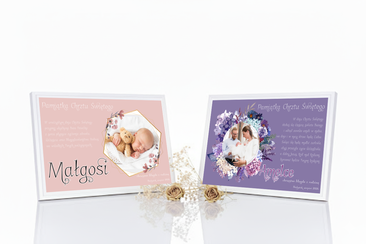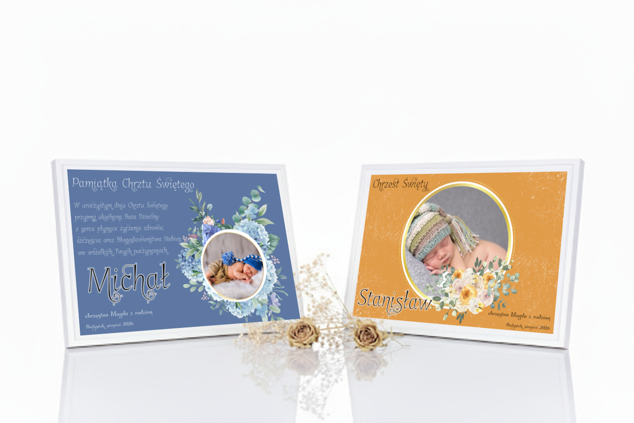 Każda pamiątka wykonywana jest indywidualnie. Na statuetce można umieścić zdjęcie maluszka, imię, datę Chrztu oraz dedykację. Druk Ink-Jet (UV) gwarantuje wysoką rozdzielczość i trwałość, a biały podkład wydobywa delikatność barw. To prezent osobisty, pełen emocji i duchowego ciepła.