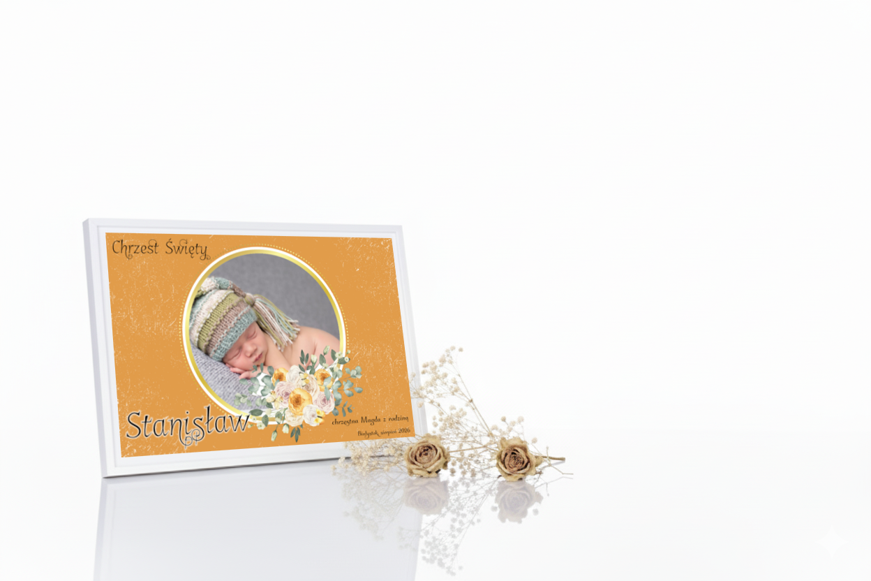 Pamiątkowa statuetka z okazji Chrztu Świętego wykonana na białym podkładzie z nadrukiem Ink-Jet to wyjątkowy prezent o głębokim znaczeniu. Obraz ze zdjęciem maluszka utrwala moment włączenia do wspólnoty wiary, łącząc duchowość i elegancję w stylu AUREA CLASSIC™.