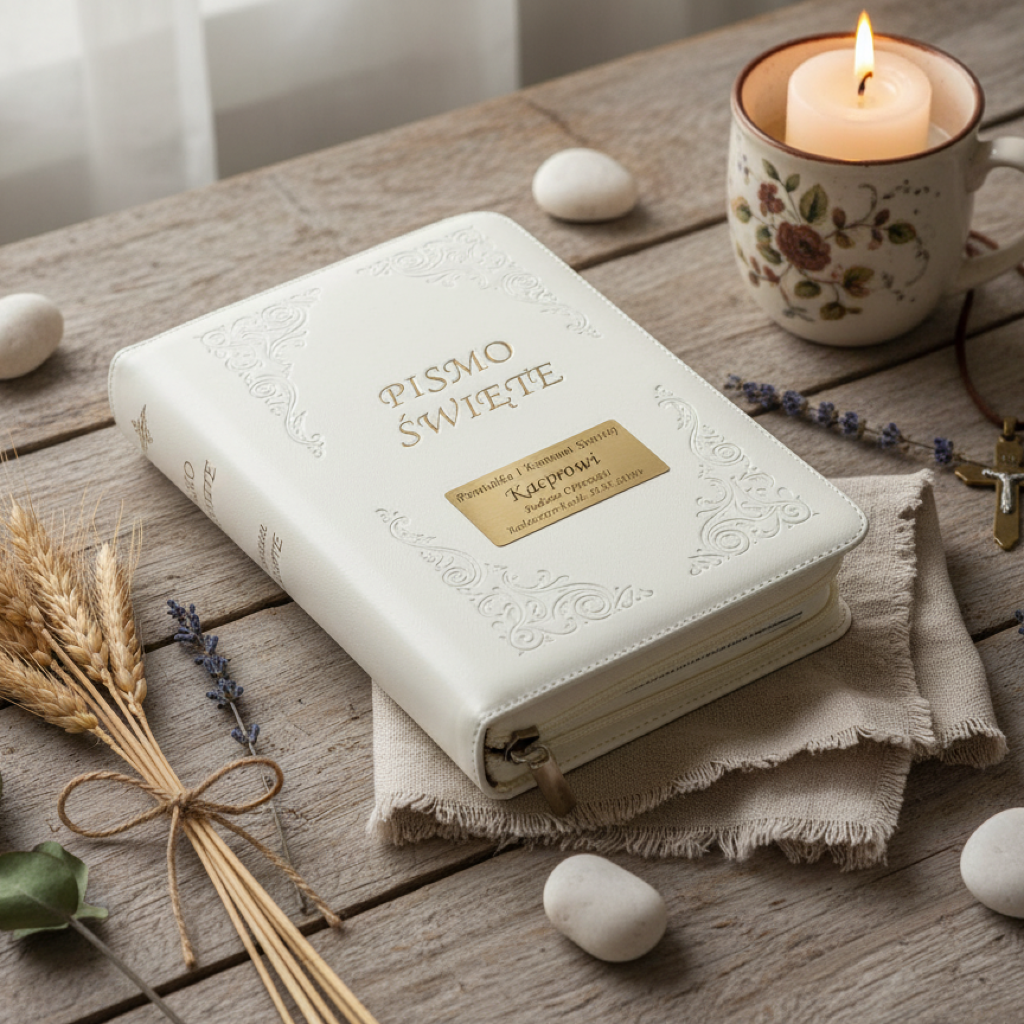 Na okładce umieszczamy tabliczkę z grawerem wykonaną na złotym laminacie o wymiarach 5,5 × 2,7 cm. Możesz dodać imię, datę, cytat lub krótką dedykację – dzięki temu egzemplarz nabiera indywidualnego znaczenia i staje się niepowtarzalną pamiątką dla obdarowanej osoby. To doskonały wybór na prezent z okazji sakramentów, jubileuszu, ślubowania lub rozpoczęcia nowej drogi duchowej.
