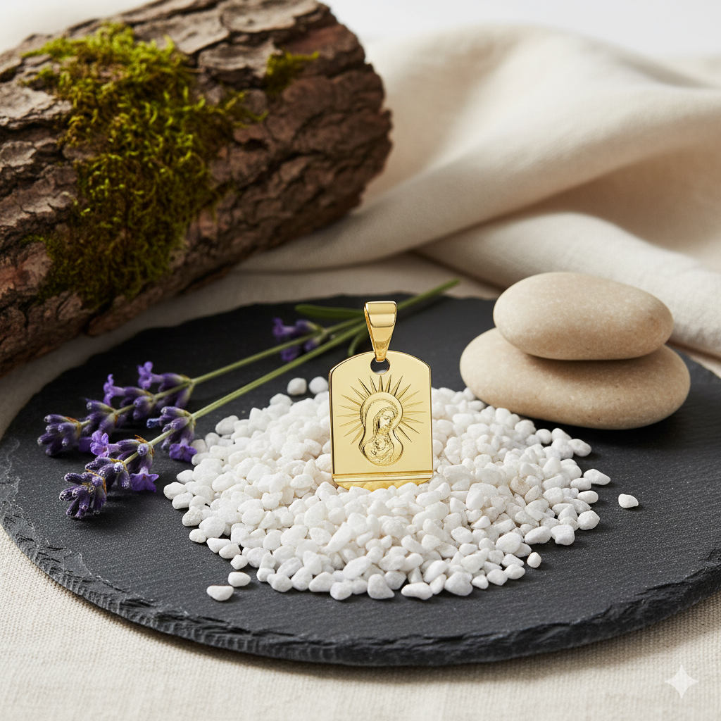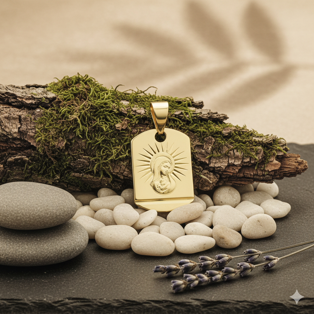 Niech pozłacany medalik z wizerunkiem Madonny przypomina o świetle Maryi, które rozjaśnia drogę wiary i przynosi spokój każdemu sercu.