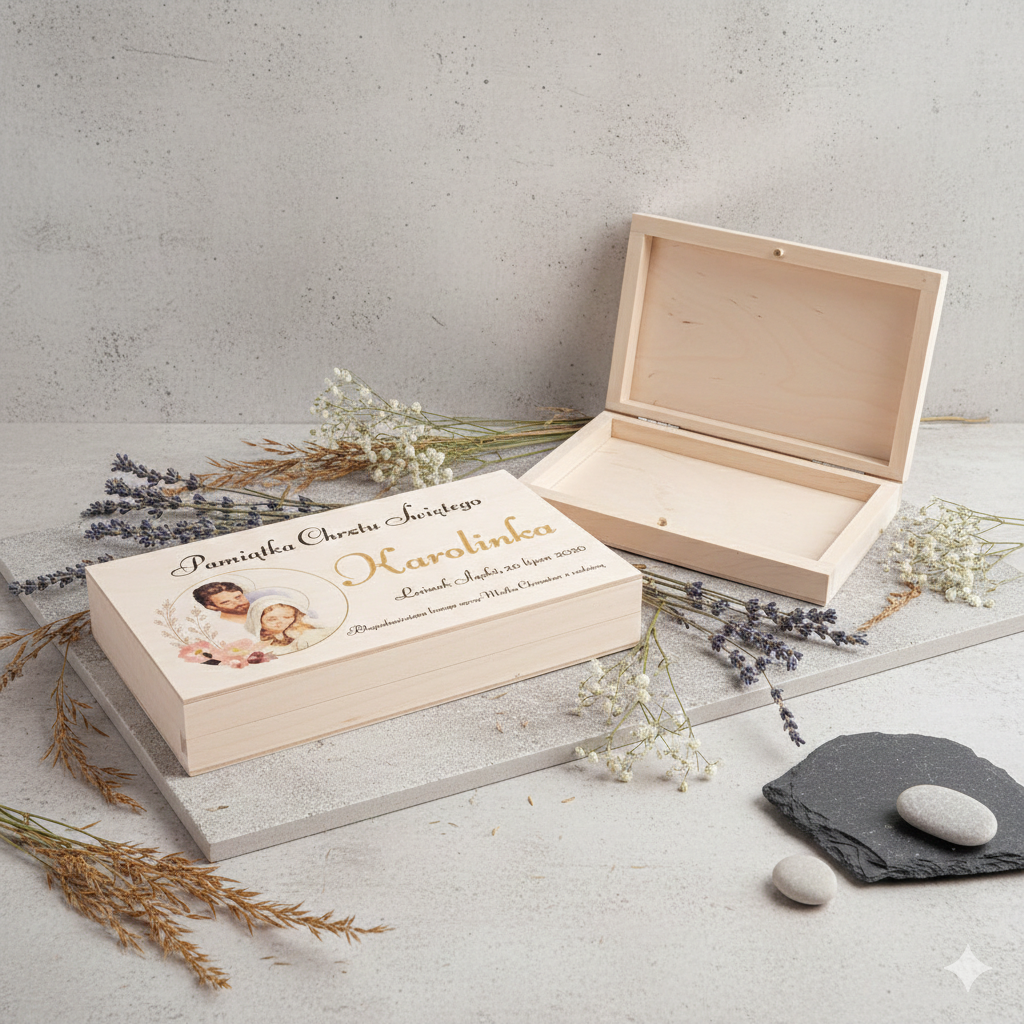 Pudełeczko drewniane EKO ♻ z nadrukiem Ink-Jet to elegancka i ponadczasowa pamiątka Chrztu Świętego, która łączy naturalne drewno z nowoczesną technologią personalizacji. Jasna kasetka wykonana z drewna prezentuje się subtelnie i szlachetnie, a indywidualny nadruk nadaje jej osobisty, emocjonalny charakter.