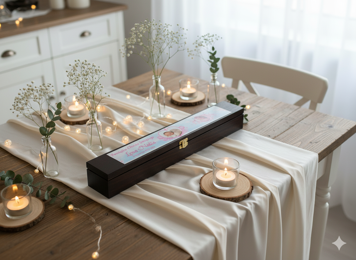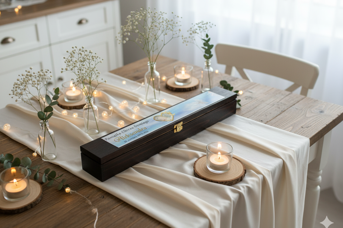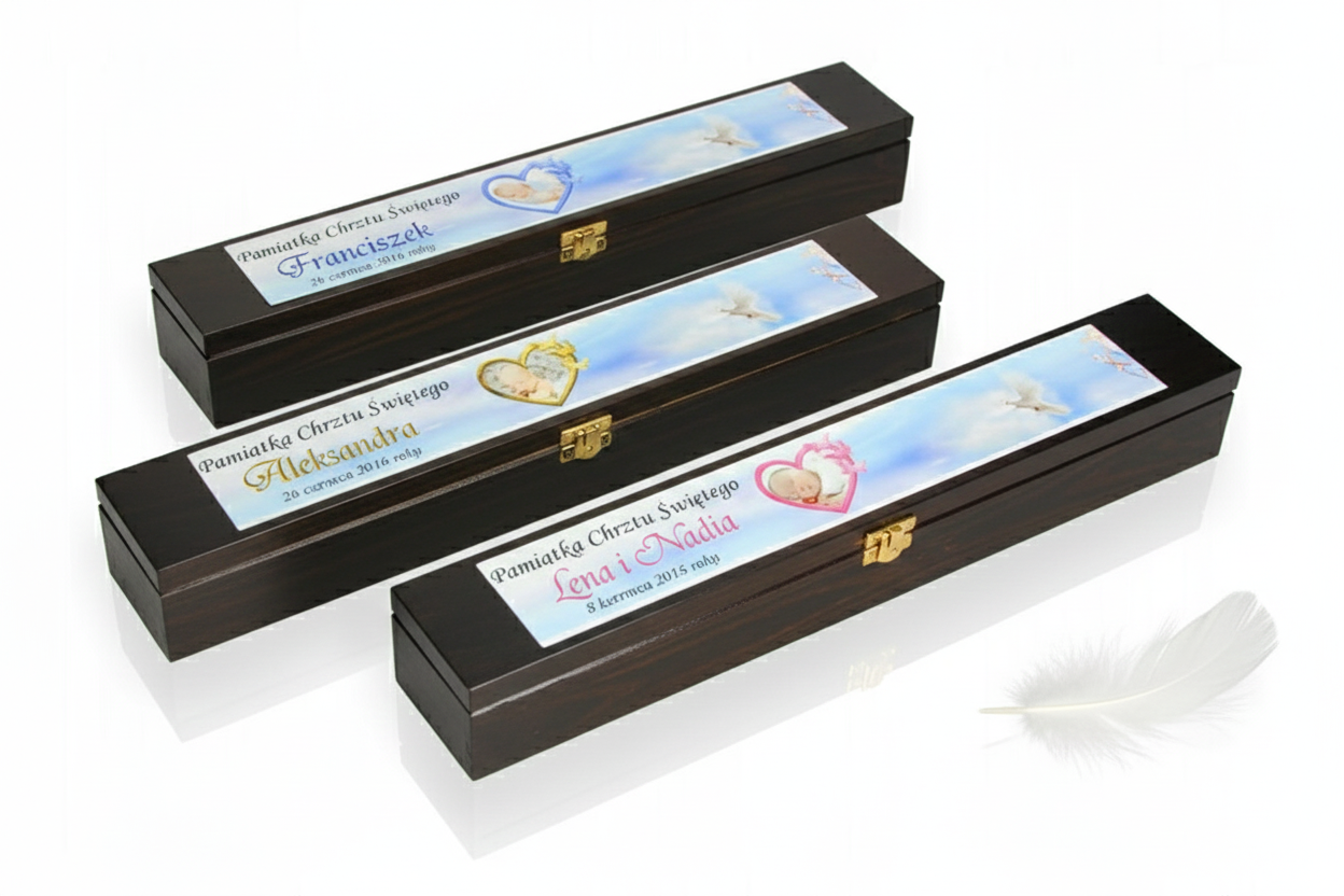 Pudełko personalizujemy poprzez nadruk fotograficzny w technologii Ink-Jet, który łączy precyzję wykonania z trwałością i eleganckim efektem wizualnym. Można umieścić imię dziecka, datę Chrztu oraz krótką dedykację. Połączenie głębokiego koloru drewna wenge z subtelną grafiką sprawia, że każda pamiątka staje się wyjątkowa i pełna duchowego znaczenia.