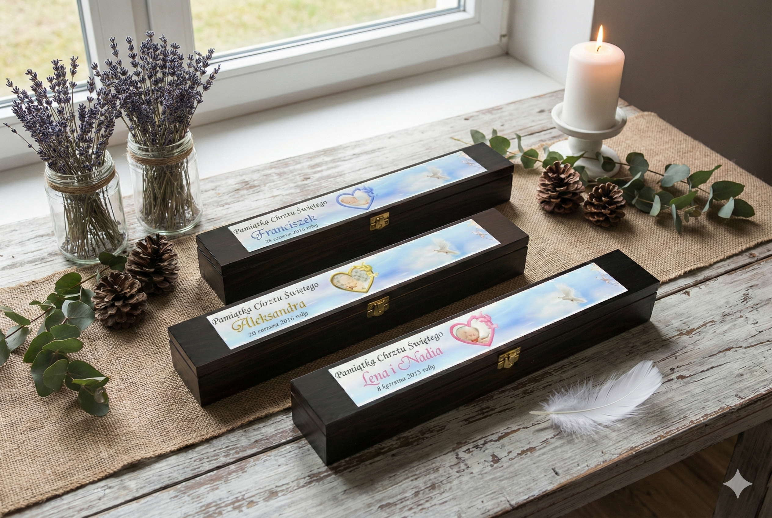 Każdy z wariantów pozwala dopasować pudełko do charakteru uroczystości oraz estetyki zestawu chrzcielnego, zachowując duchową spójność i delikatność przekazu.