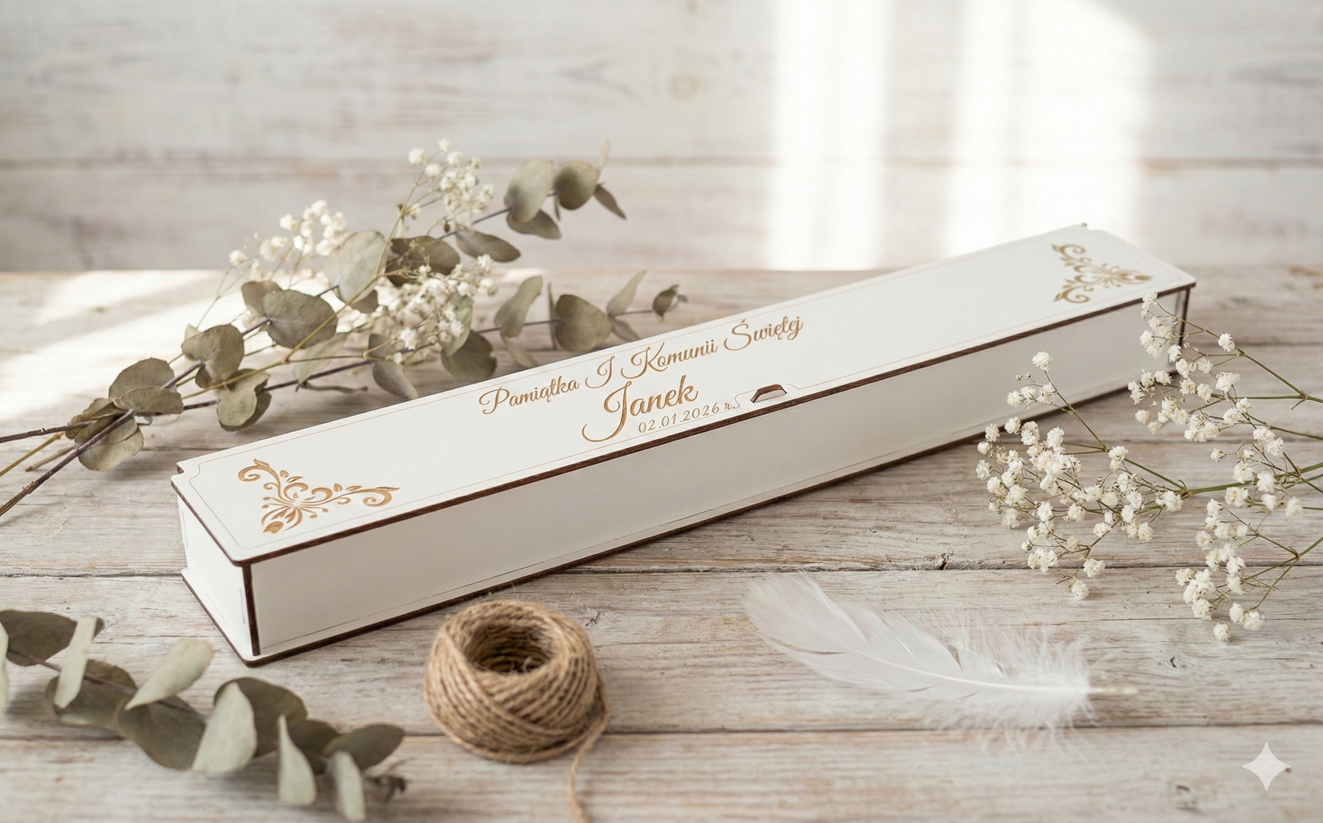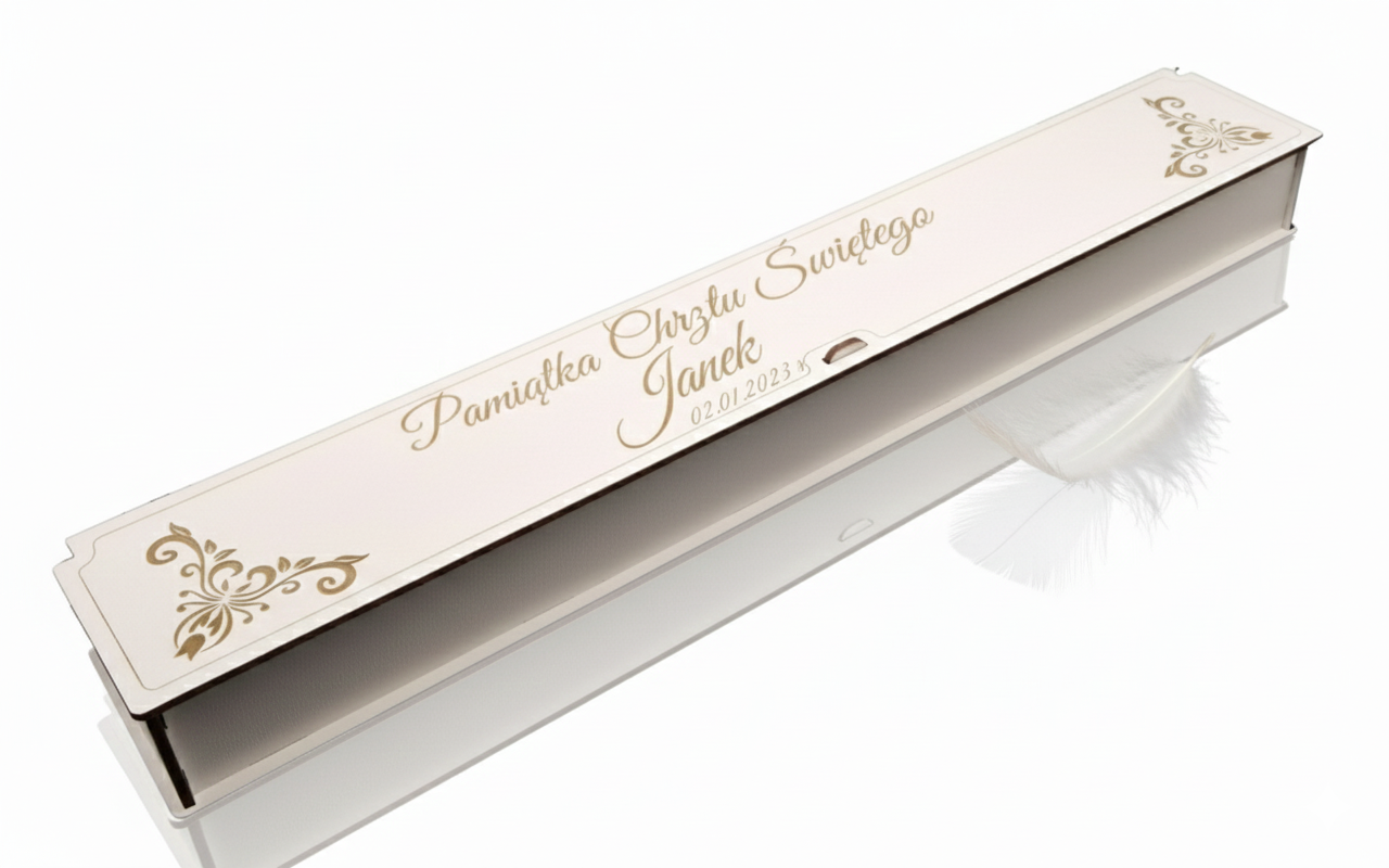 Na wieku pudełka wykonujemy grawer metodą ablacji laserowej, dzięki czemu ornament i dedykacja uzyskują niezwykle precyzyjny, estetyczny efekt. Personalizacja może obejmować imię, datę, błogosławieństwo lub napis „Pamiątka sakramentu”. Każdy detal wypalany jest z dbałością o duchową symbolikę i piękno formy.