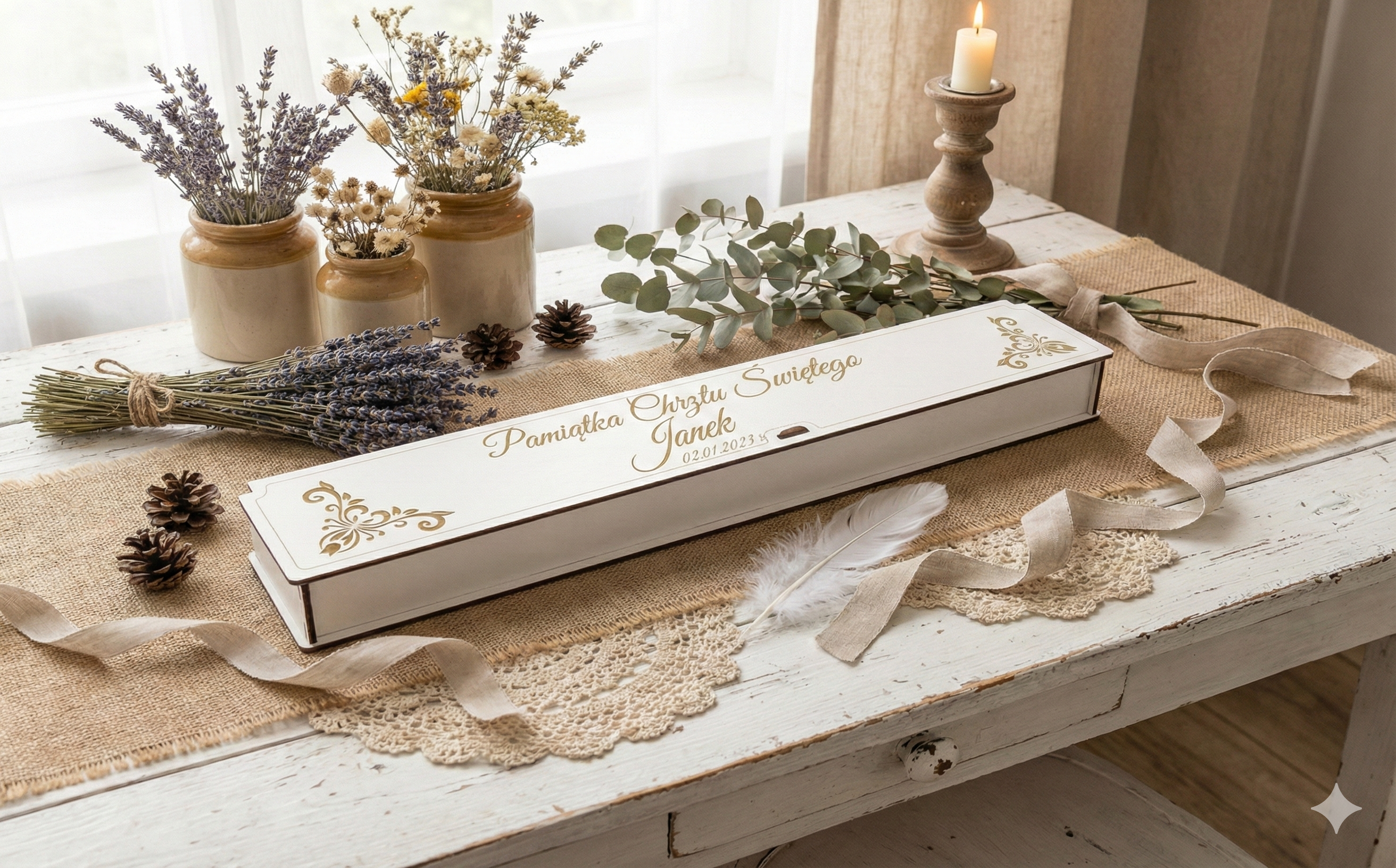 Drewniane pudełko z ozdobnym grawerem i ornamentem to elegancka pamiątka na świecę gromniczną. Precyzyjny grawer laserowy, tradycyjny motyw i polska jakość wykonania – idealny prezent o duchowym znaczeniu.