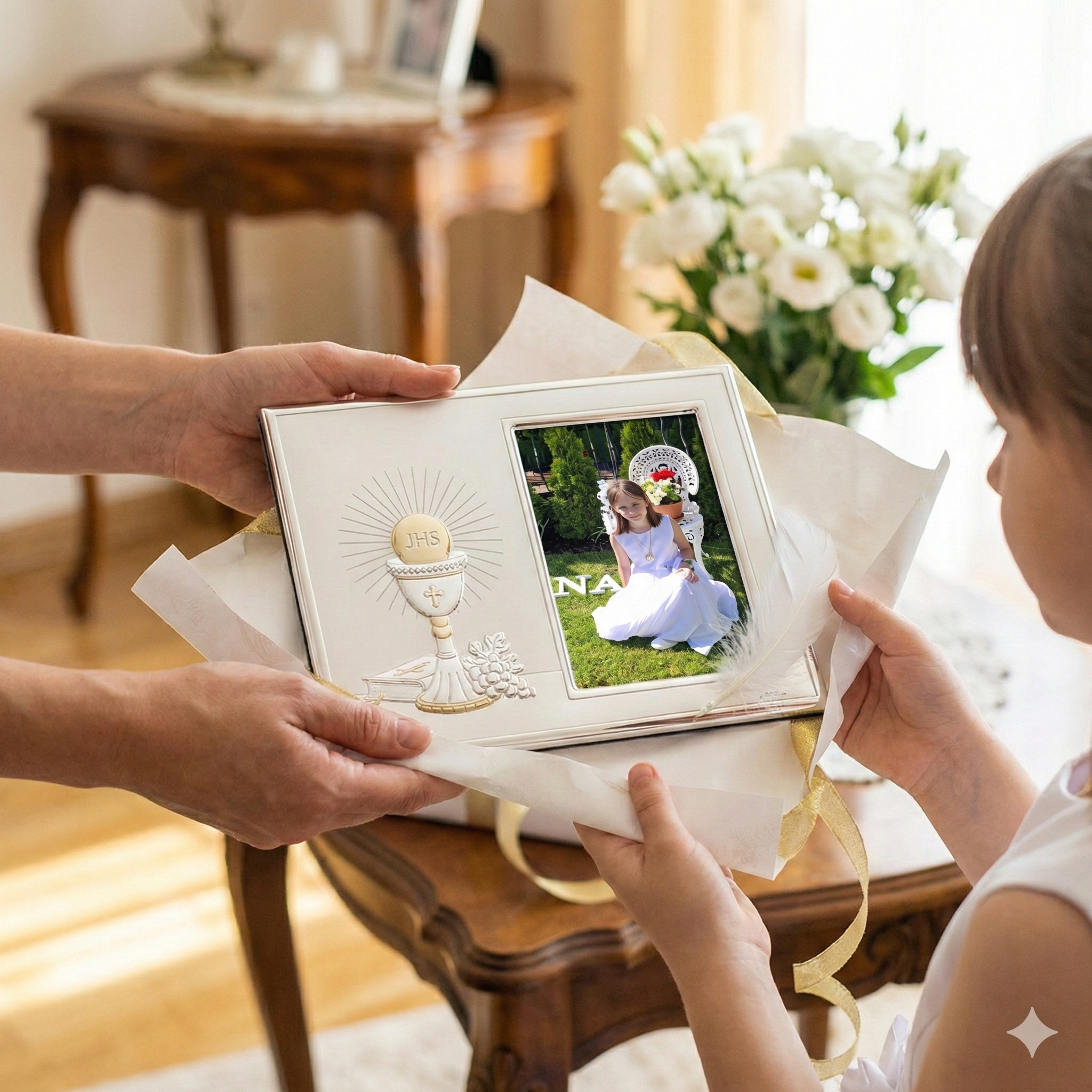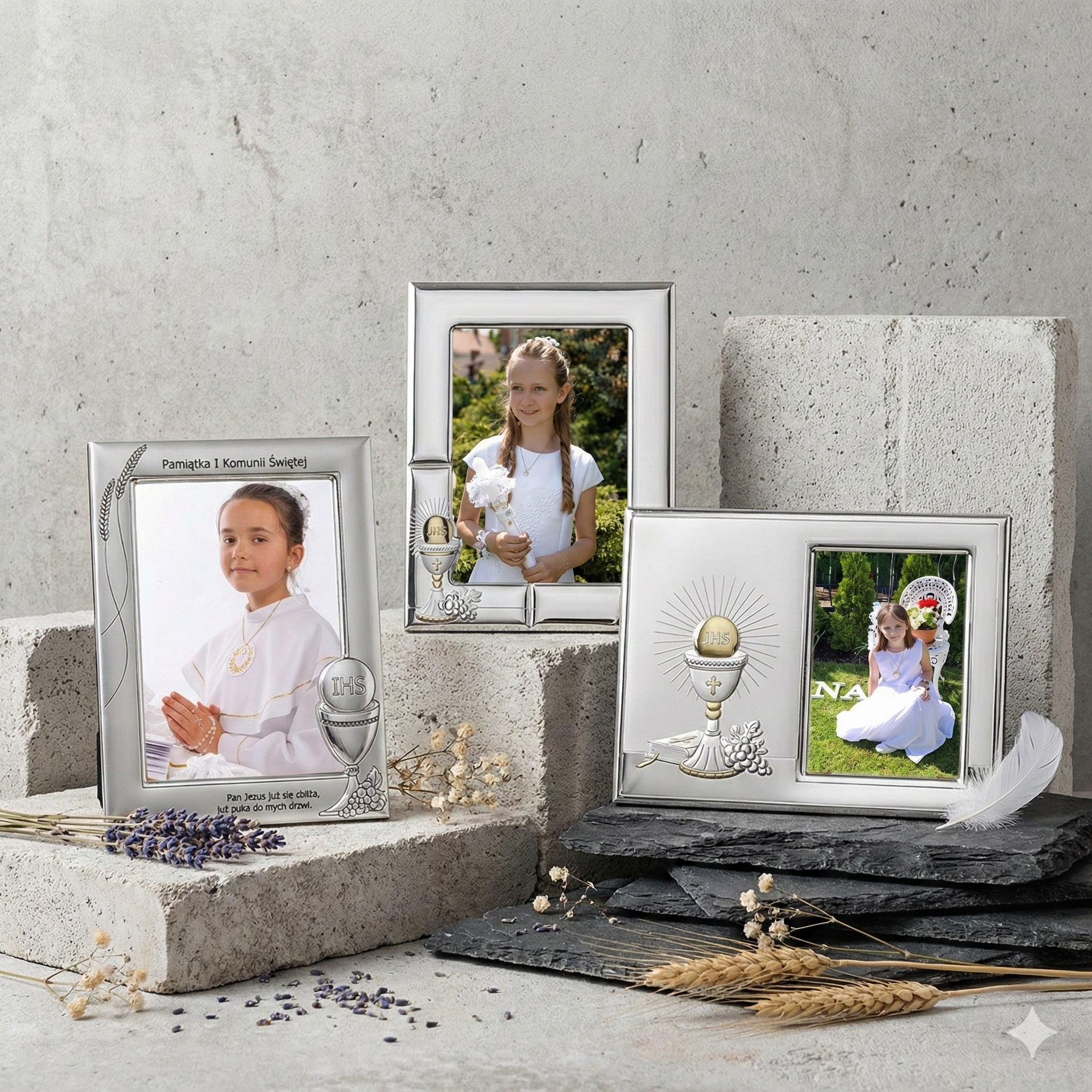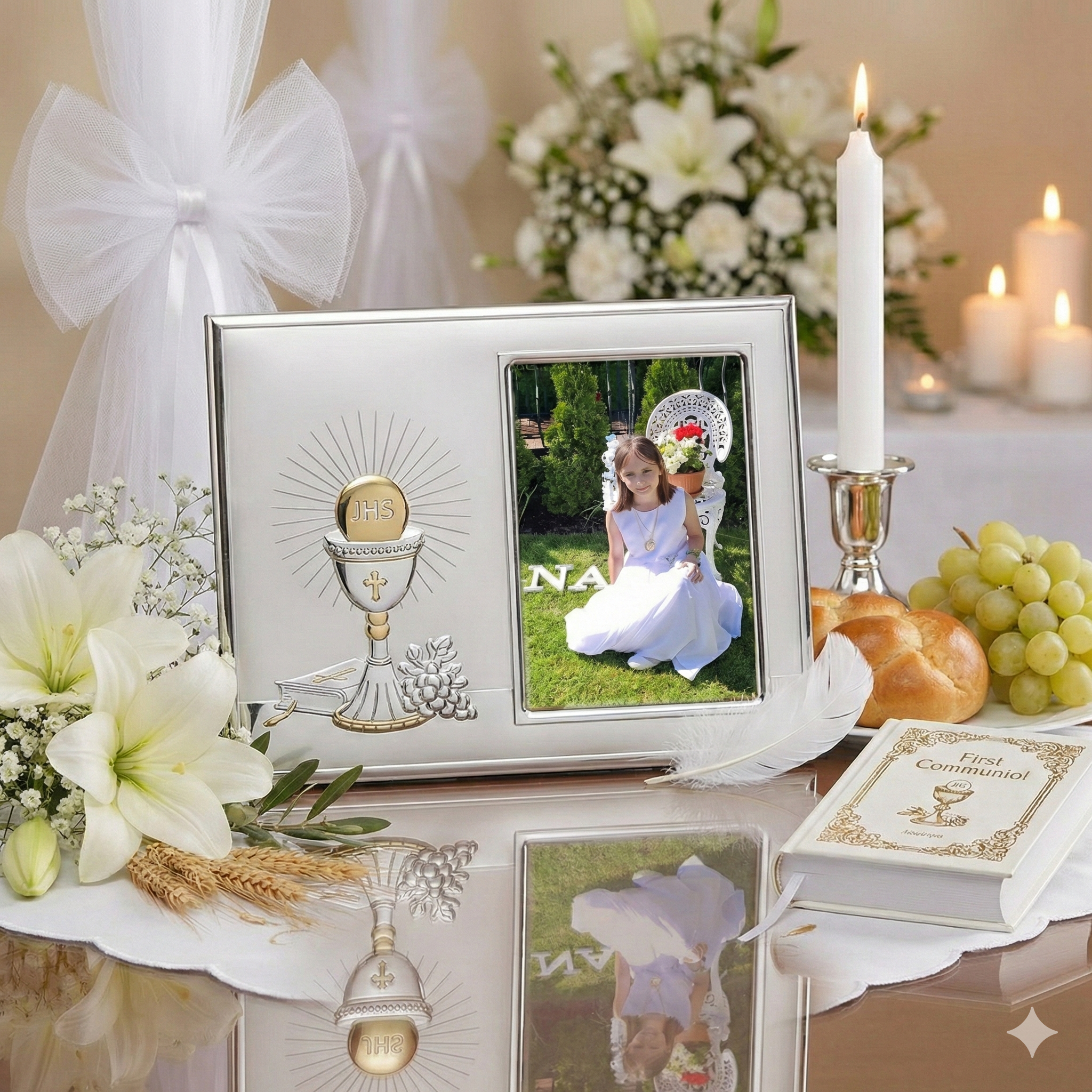 Poziomy układ ramki nadaje całości narracyjny charakter, czyniąc z fotografii komunijnej świadectwo duchowej drogi dziecka.