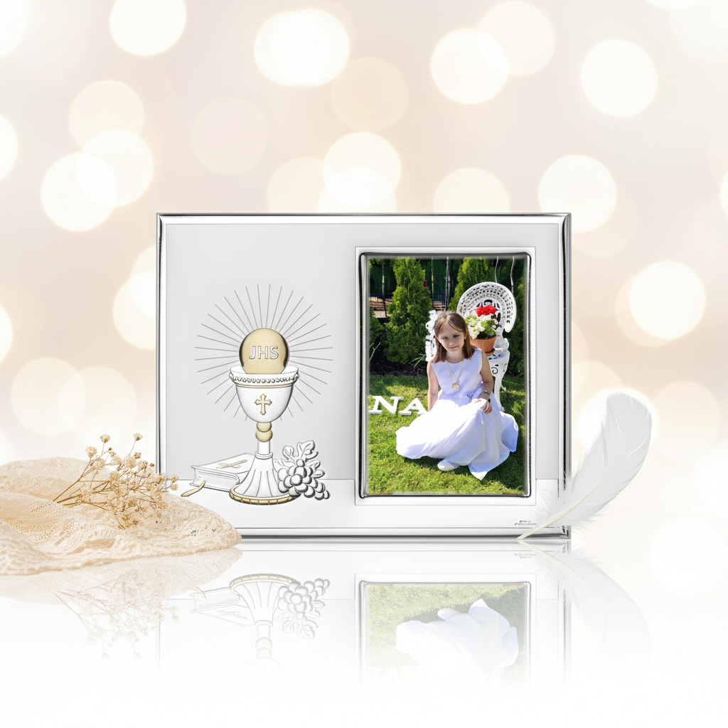 Srebrna ramka AG999 na zdjęcie 10×15 cm z motywem Hostii IHS, Biblii i winorośli z kolekcji SILVER COMMUNION™ to wyjątkowa pamiątka Pierwszej Komunii Świętej, łącząca w jednej kompozycji najważniejsze filary życia chrześcijańskiego: Eucharystię, Słowo Boże oraz wspólnotę wiary.