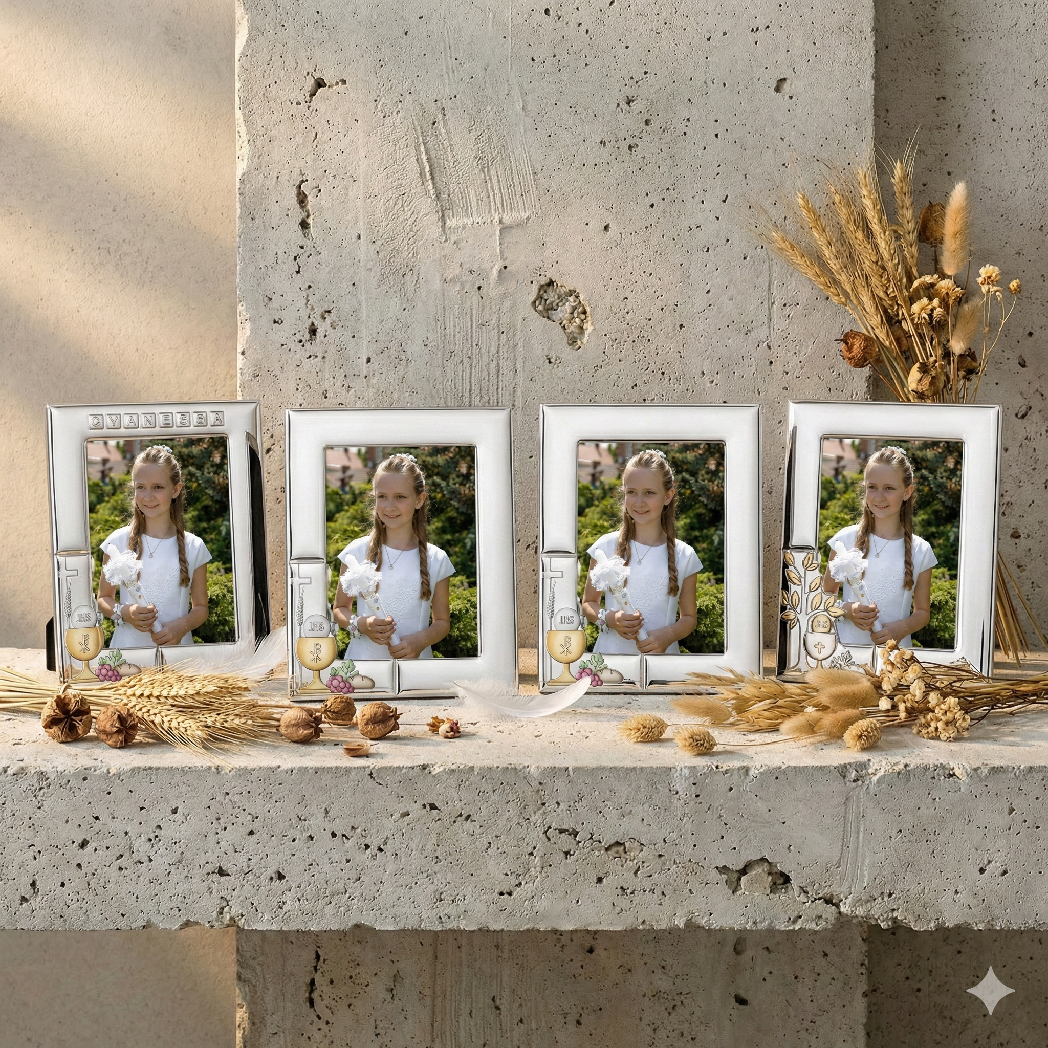 Ramka subtelnie podkreśla znaczenie dnia Pierwszej Komunii Świętej, stając się trwałym świadectwem duchowego rozwoju dziecka.