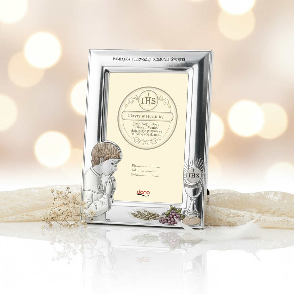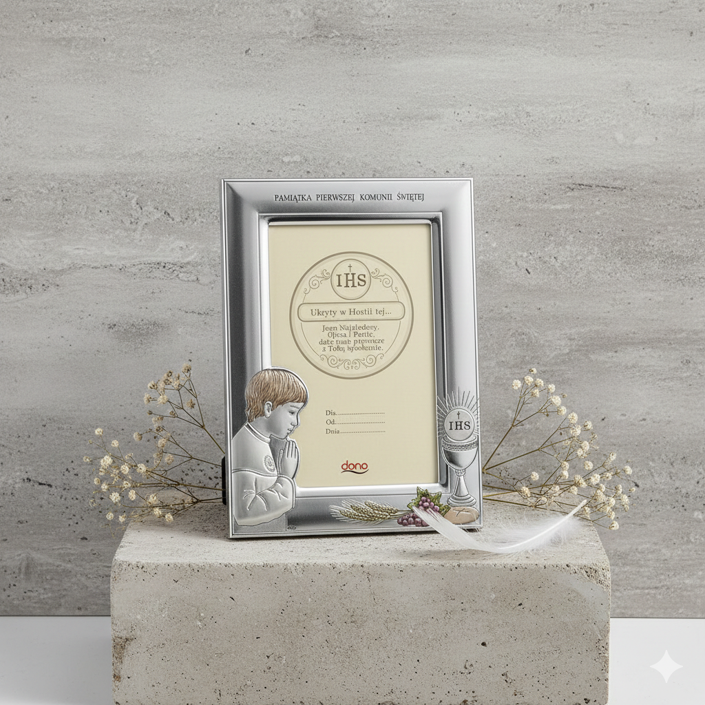 Elegancka ramka srebrna AG999 na zdjęcie 13×18 cm z motywem Hostii IHS oraz wizerunkiem chłopca komunijnego, wykonana w technologii MIRO-SILVER®. Wyjątkowa pamiątka Pierwszej Komunii Świętej, łącząca symbolikę Eucharystii z osobistym wymiarem uroczystości.