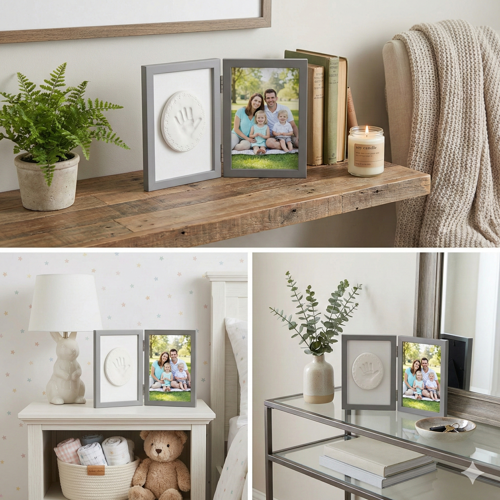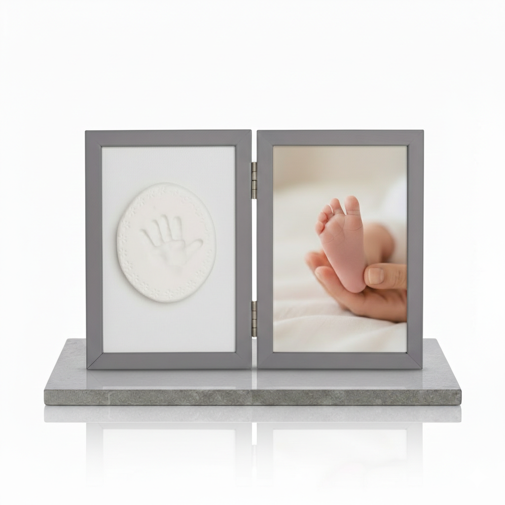 Zestaw TINY MEMORIES to elegancka ramka z glinką do wykonania odcisku rączki lub stópki dziecka. Pozwala zatrzymać w czasie momenty, które mijają najszybciej – pierwsze miesiące życia, maleńkie dłonie i stopy, delikatność dzieciństwa.