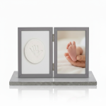 Ramka wykonana została z naturalnego drewna w subtelnym, szarym odcieniu. Składa się z dwóch części – jednej przeznaczonej na zdjęcie dziecka, drugiej na pamiątkowy odcisk.