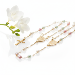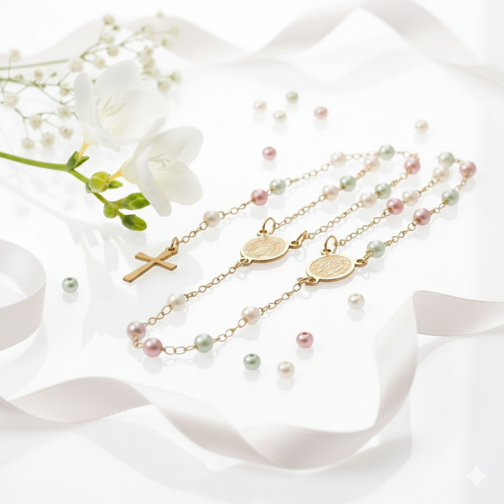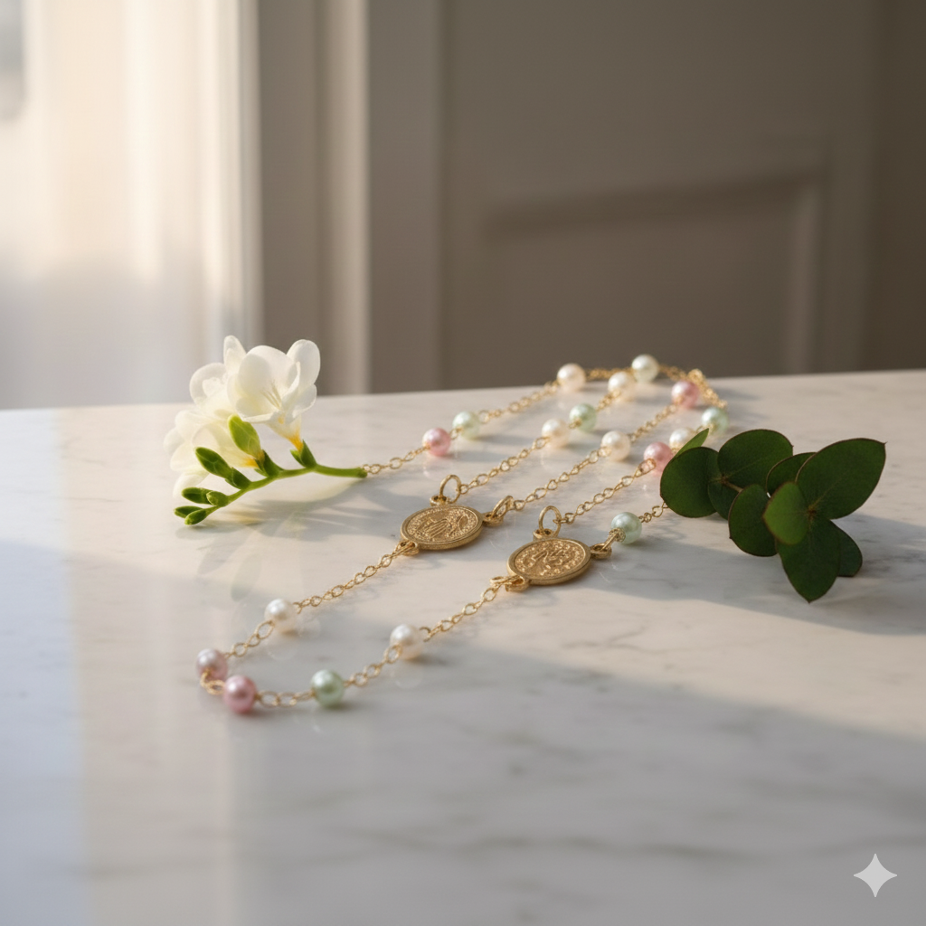 Ten wyjątkowy różaniec-naszyjnik z wizerunkiem Matki Bożej Niepokalanej łączy duchową symbolikę z elegancją codziennej biżuterii, pozwalając nosić modlitwę zawsze blisko serca.