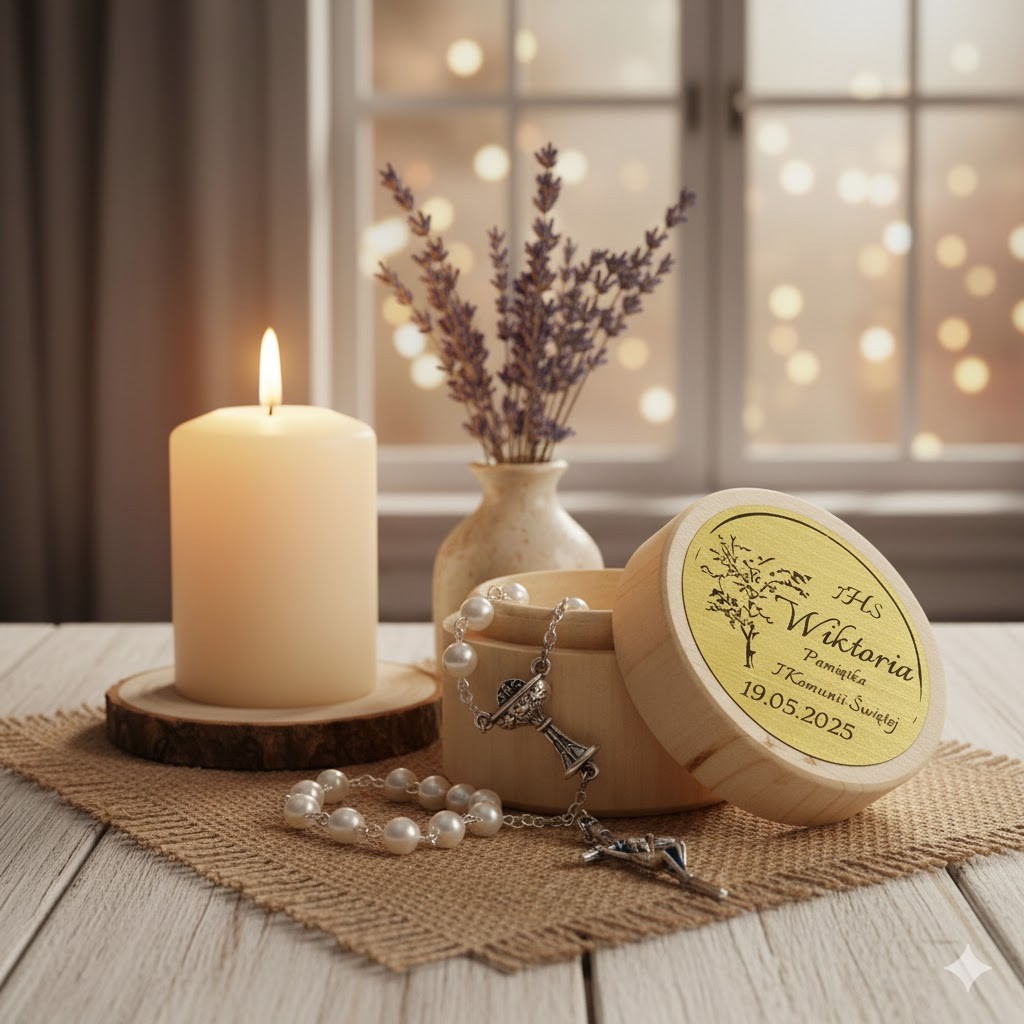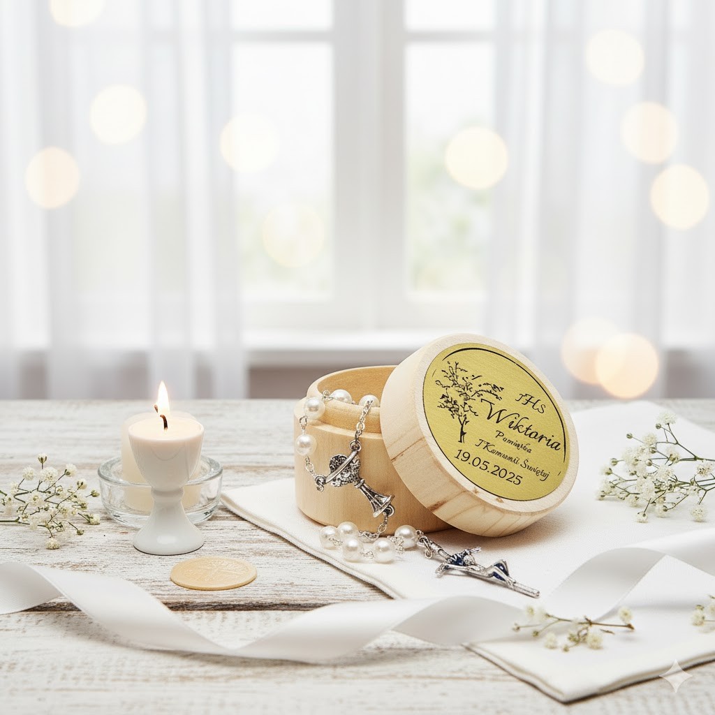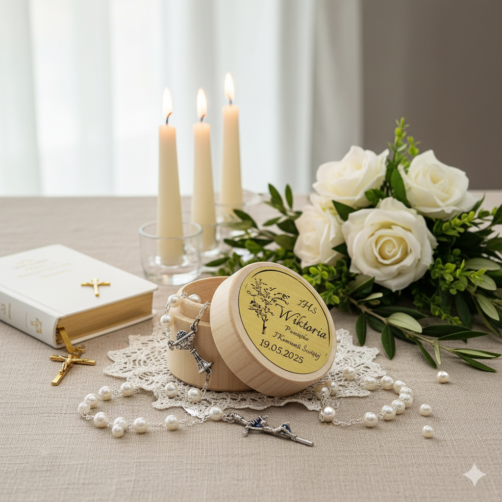 Na wieku pudełka wykonujemy precyzyjny grawer laserowy – z imieniem dziecka, datą uroczystości lub dedykacją. Technologia grawerowania laserowego zapewnia niezwykłą trwałość, kontrast i elegancję. Każdy egzemplarz powstaje indywidualnie, z dbałością o detale i duchowy wymiar uroczystości.