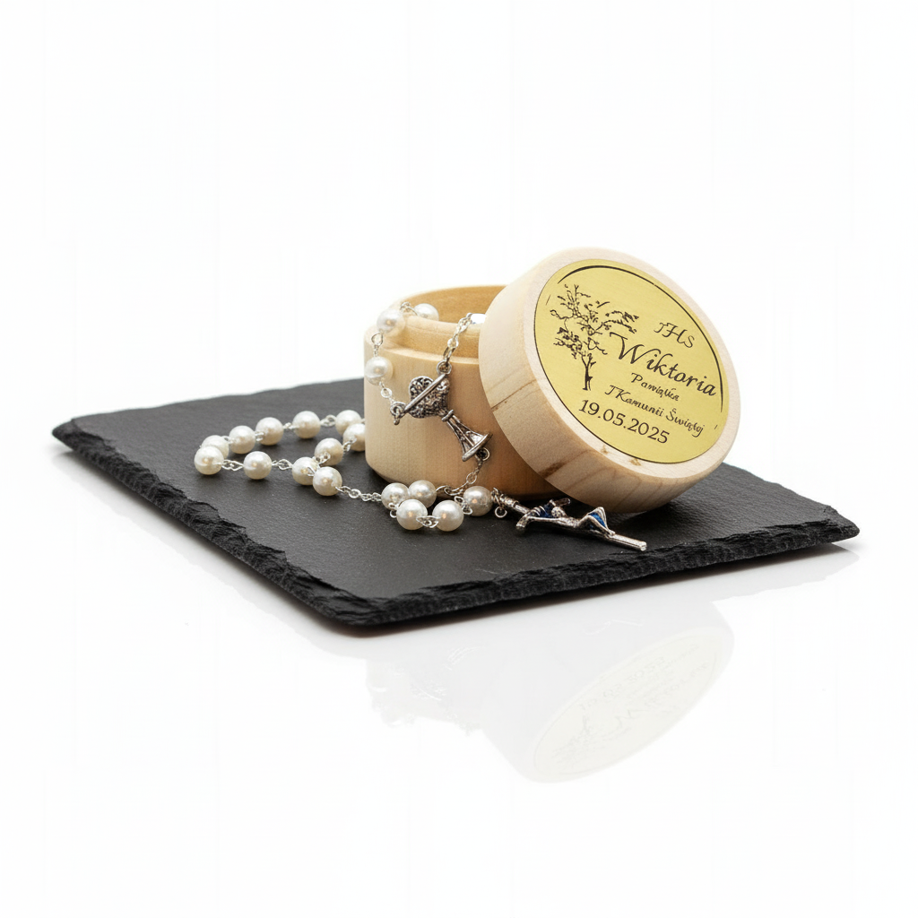 Różaniec komunijny z białych perełek w eleganckim drewnianym pudełku z grawerem laserowym. Trwała pamiątka I Komunii Świętej z kolekcji MEMORIA WOOD™ – duchowość, estetyka i indywidualny charakter w jednym prezencie.