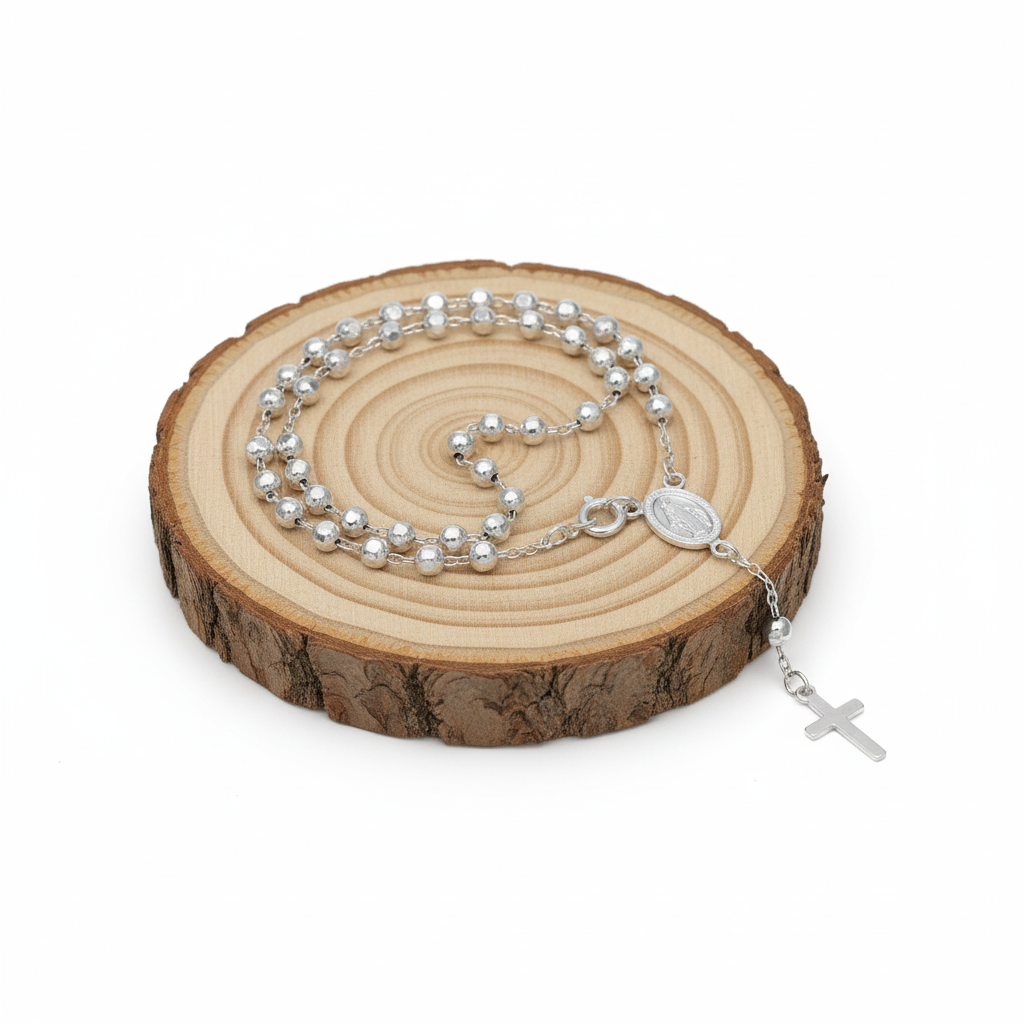 Różaniec wykonano ze srebra próby 925 o długości ok. 50 cm i średnicy paciorków 3,0 mm. Każdy egzemplarz posiada polski znak probierczy potwierdzający autentyczność srebra. Diamentowany szlif nadaje mu wyjątkowy blask i precyzyjne wykończenie.