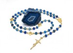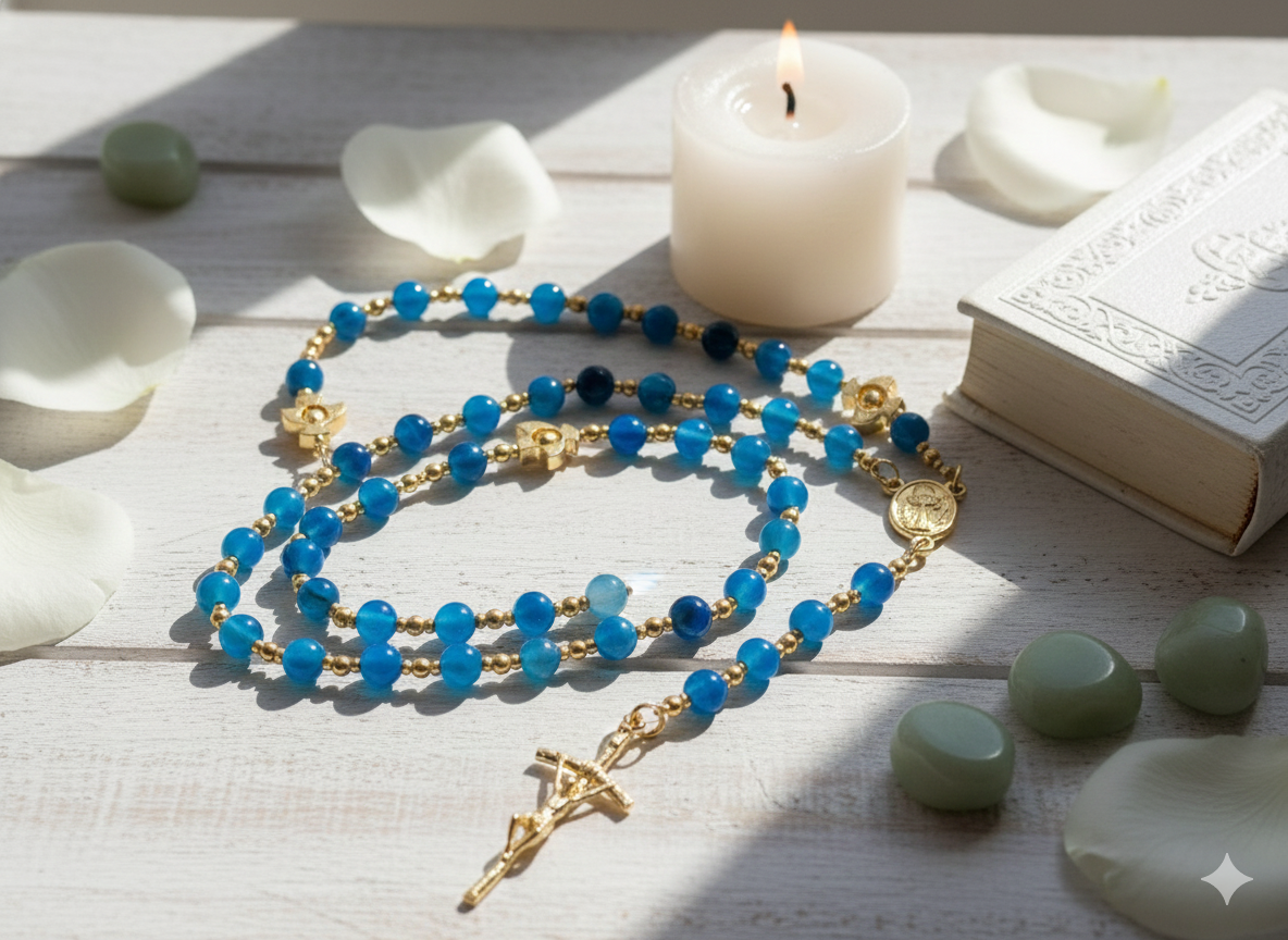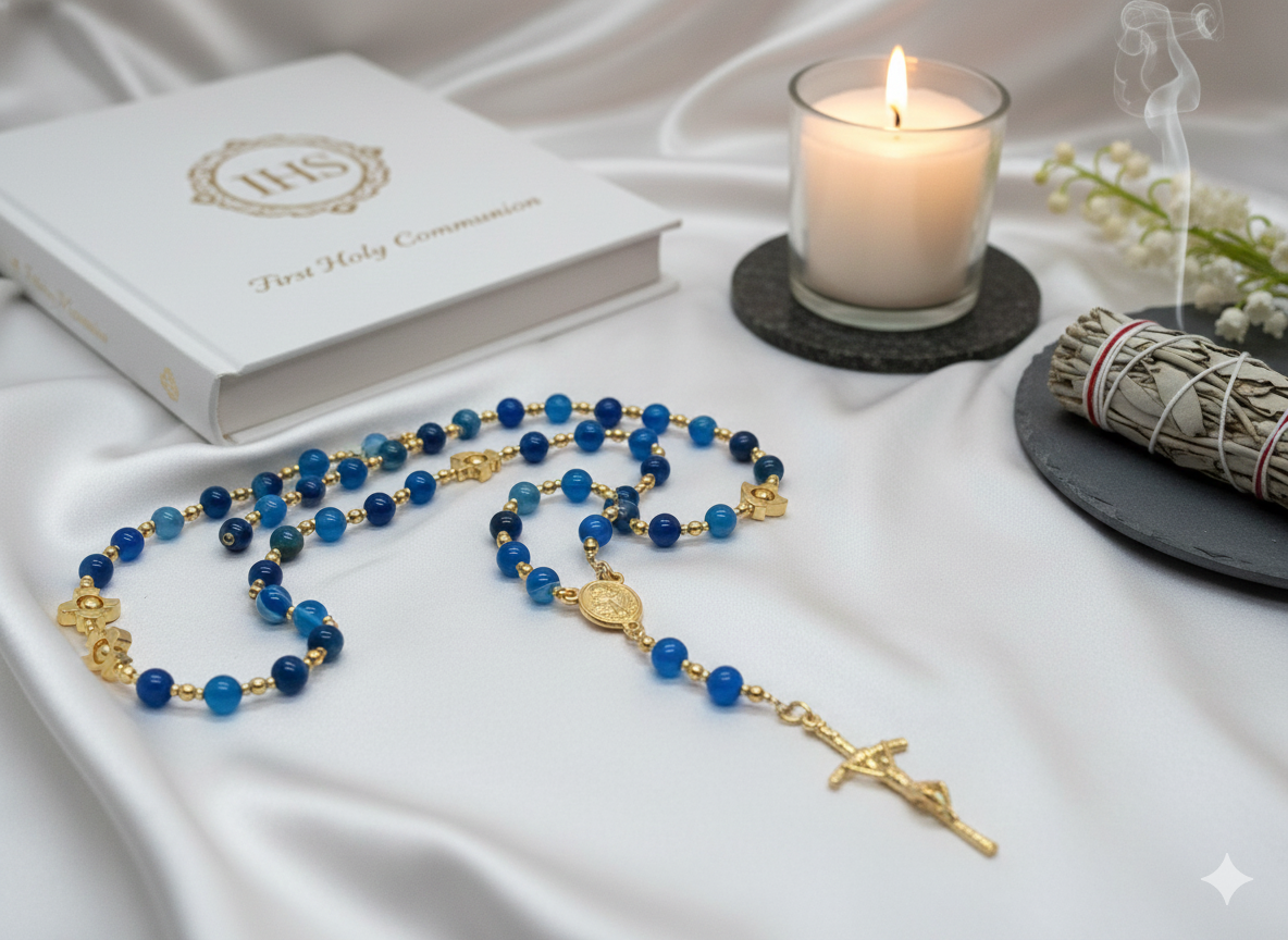 SacraStone™ PURE COMMUNIO – Różaniec IHS z agatu niebieskiego to wyjątkowa pamiątka Pierwszej Komunii Świętej, łącząca elegancję naturalnych kamieni z duchowym przesłaniem sakramentu Eucharystii. Wykonany na elastycznej gumce jubilerskiej w złotej tonacji, jest wygodny, trwały i idealnie dopasowany do codziennej modlitwy.