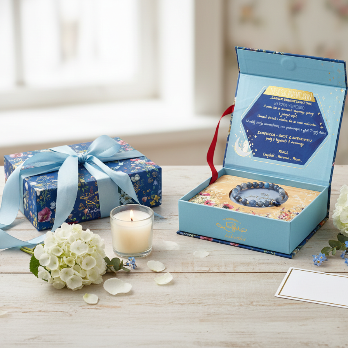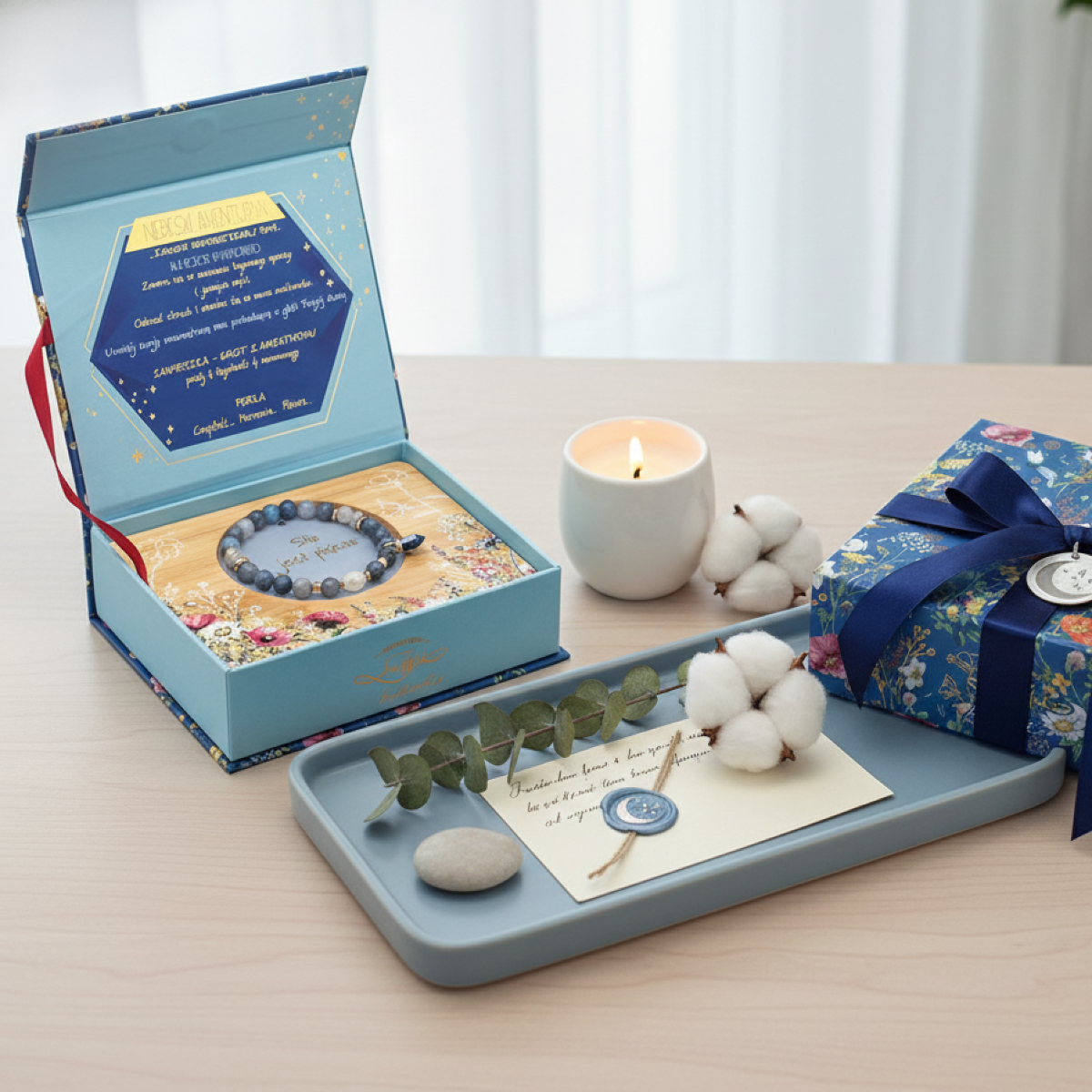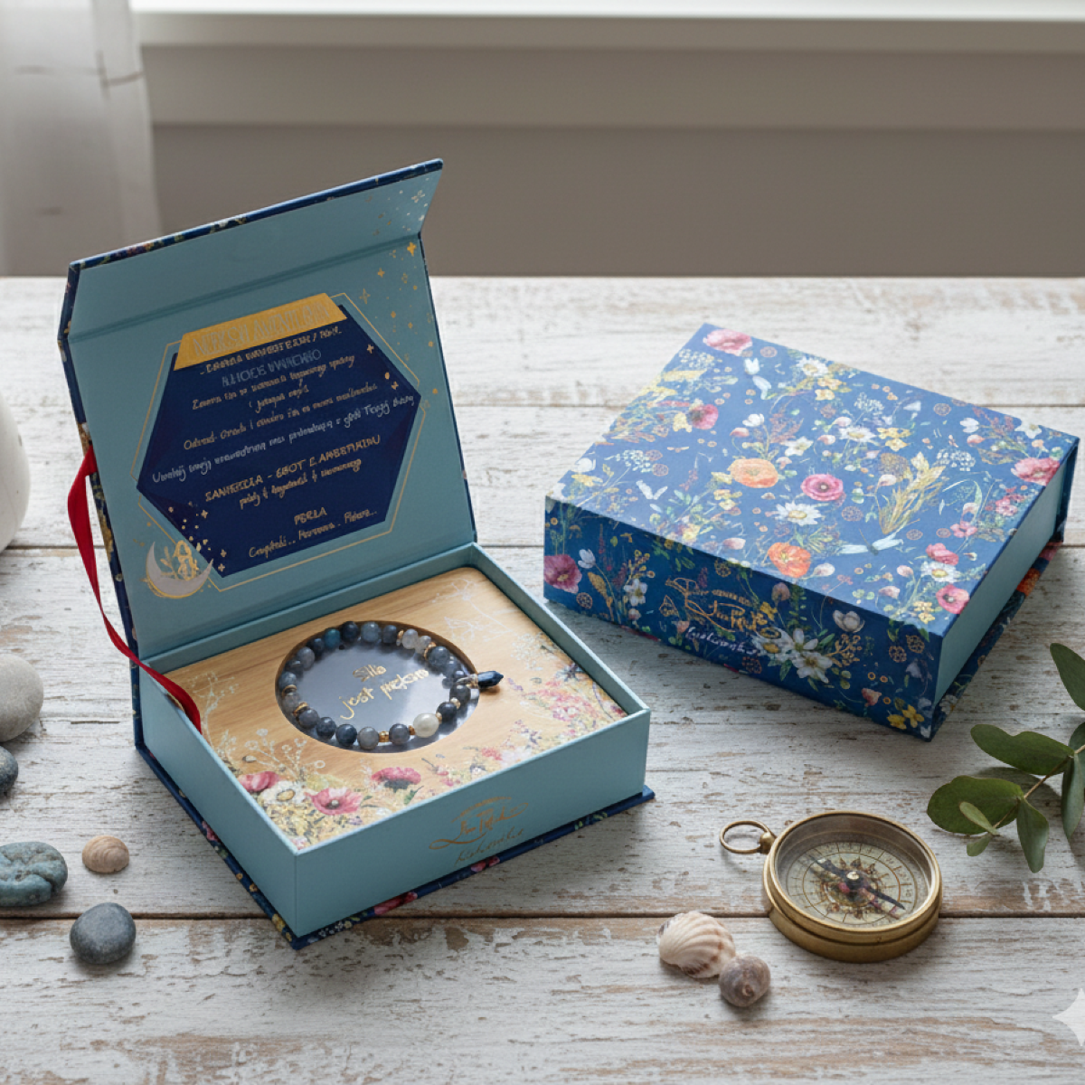 Każda bransoletka zapakowana jest w estetyczne, dopasowane kolorystycznie pamiątkowe pudełko inspirowane chłodnym tonem niebieskiego awenturynu. W środku znajduje się bambusowa taca z dekoracyjnym wycięciem — idealna do przechowywania biżuterii lub jako urocza podstawka.