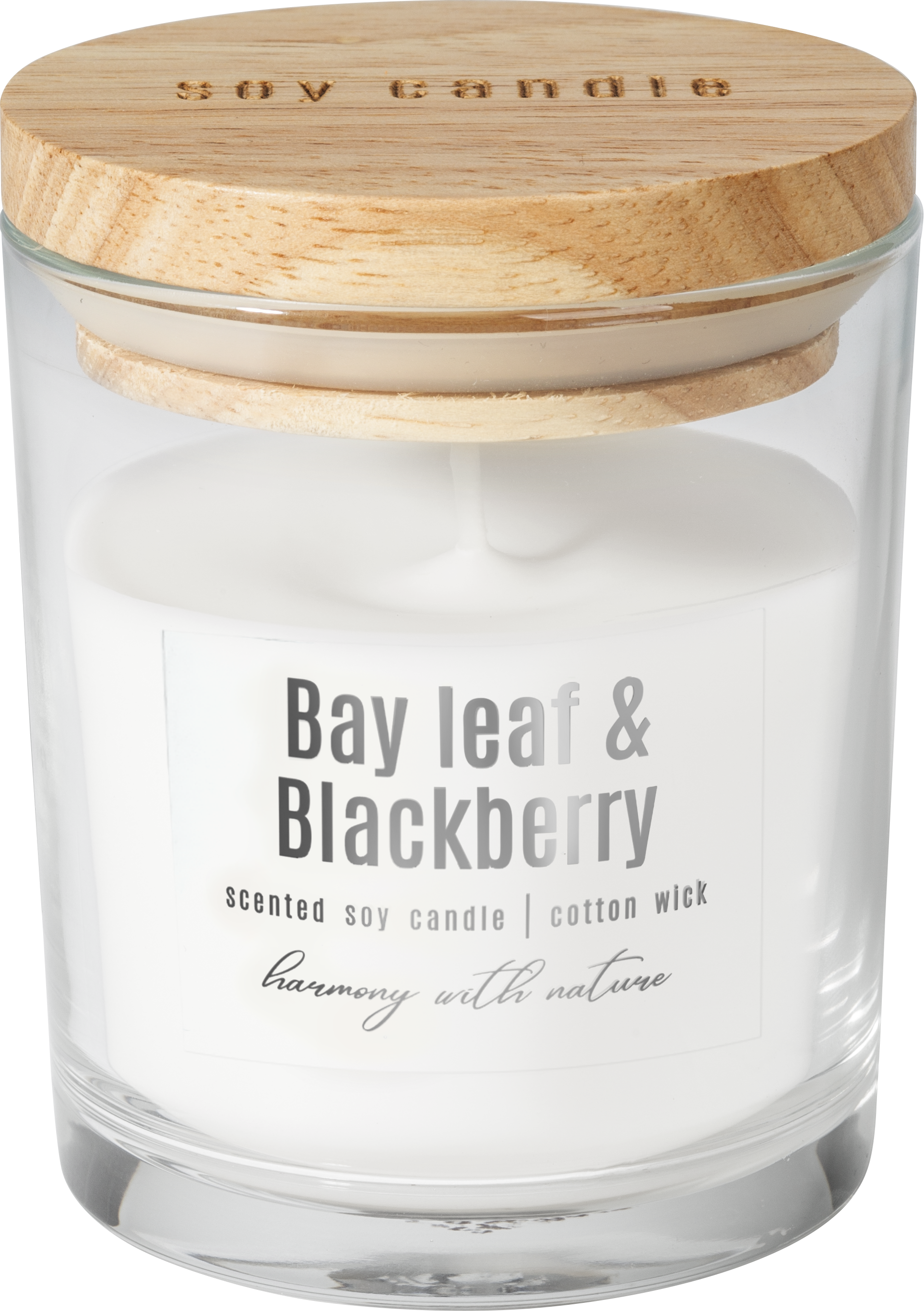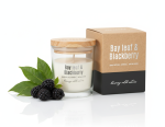 Sojowa świeca zapachowa LIŚĆ LAUROWY & JEŻYNA w szklanym słoiku z drewnianym wieczkiem – naturalny zapach owoców i ziół w ekologicznej formie. Ręcznie zalewana, wykonana z wosku sojowego, idealna do aromaterapii, relaksu i prezentu. Produkt z atestem PZH, w pełni biodegradowalny.