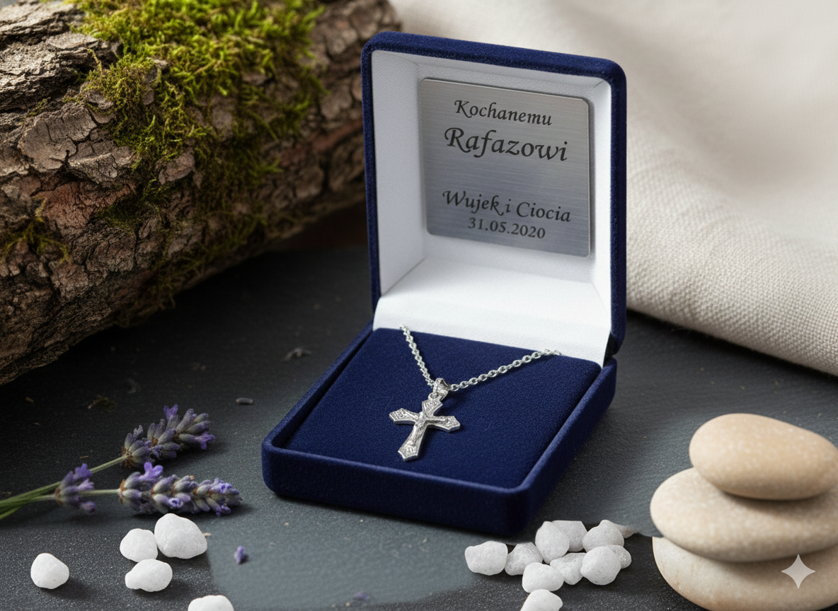 Zestaw obejmuje krzyżyk z łańcuszkiem w eleganckim pudełku z możliwością wykonania dedykacji: trwałego graweru laserowego na metalowej tabliczce lub nadruku Ink-Jet bezpośrednio na wieku. Dodaj imię, datę, cytat z Pisma Świętego lub błogosławieństwo – aby stworzyć wyjątkową pamiątkę duchową.
