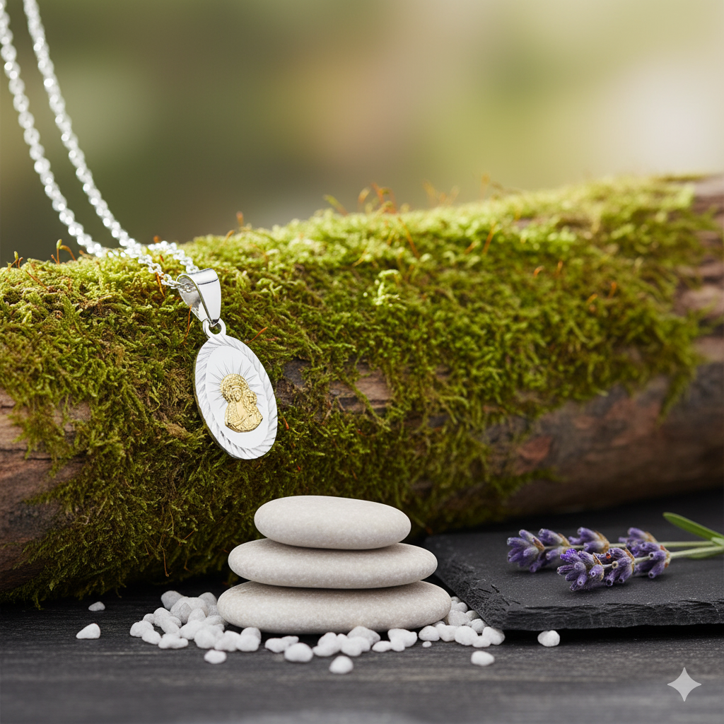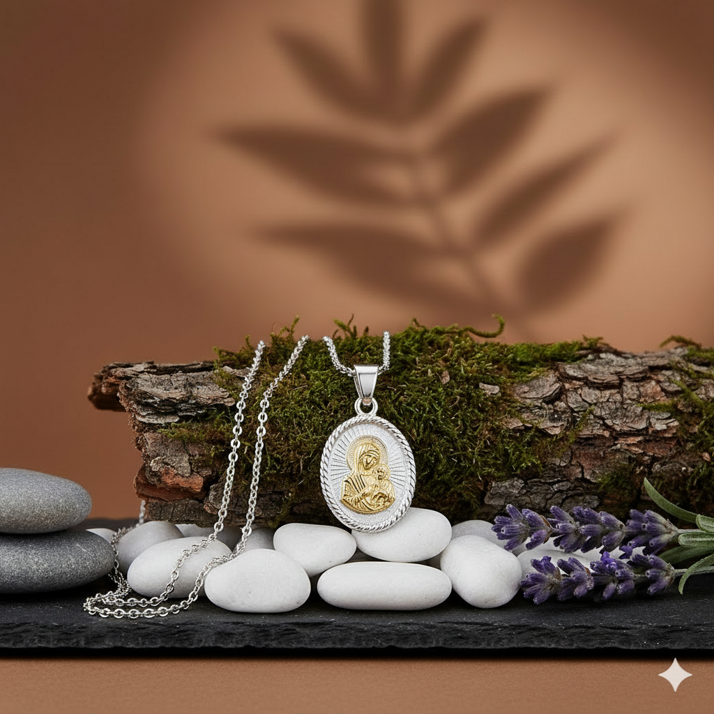 Srebrny medalik wykonany z srebra próby 925 łączy w sobie duchowy przekaz z subtelną elegancją jubilerską. To nie tylko ozdoba, ale pamiątka modlitwy i zawierzenia, przypominająca o mocy wstawiennictwa Maryi i Jej nieustającej opiece nad każdym, kto z ufnością zwraca się do Niej w modlitwie.