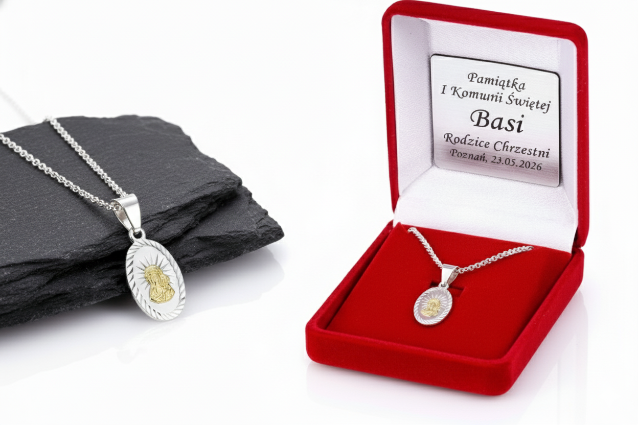 Każdy medalik umieszczony jest w ozdobnym pudełku prezentowym z możliwością wykonania grawerowanej lub drukowanej dedykacji. Wybierz kilka słów modlitwy, imię, datę lub cytat – dzięki temu pamiątka nabierze osobistego i duchowego charakteru.