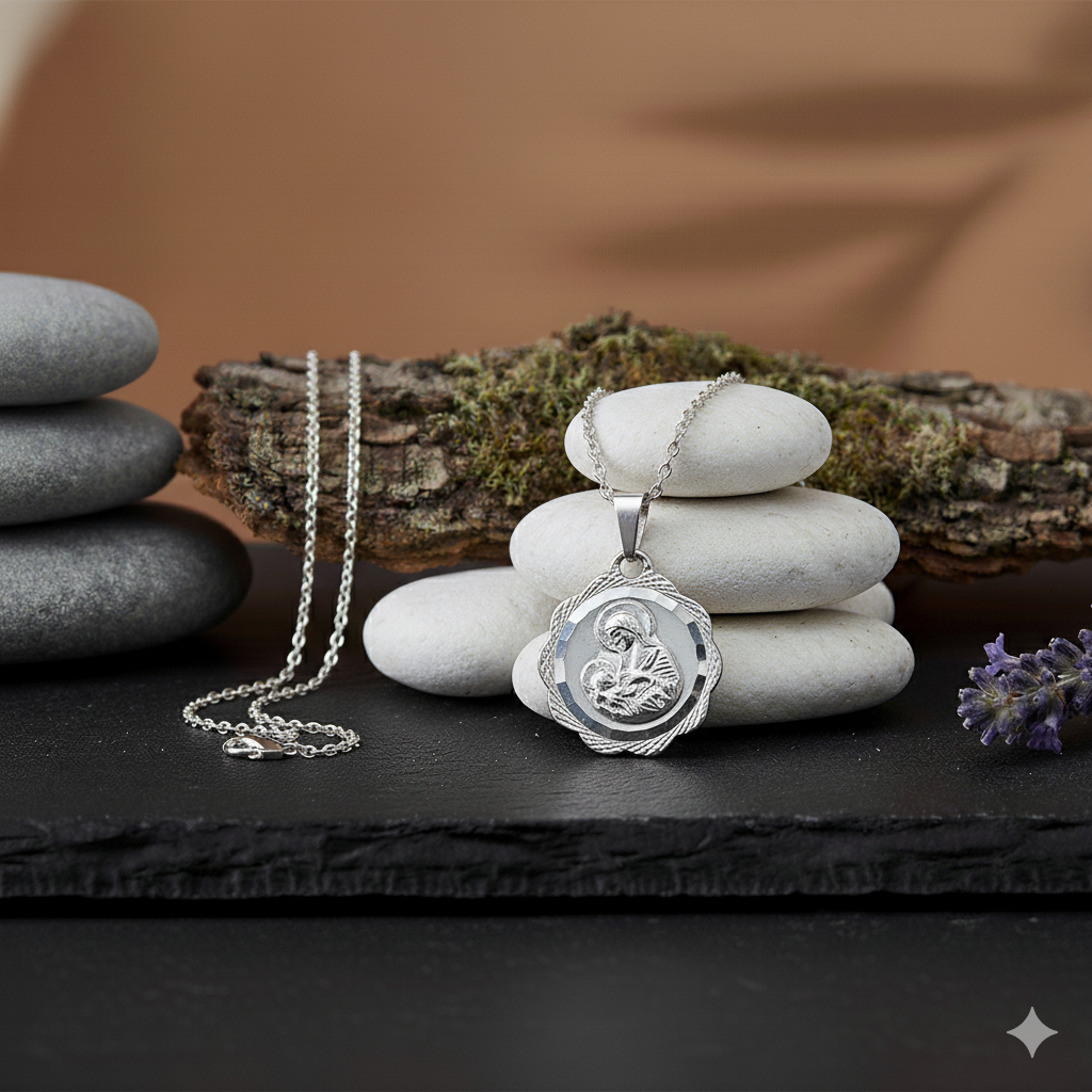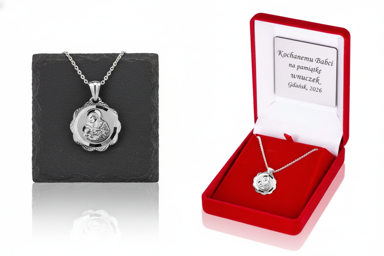 Srebrny medalik z wizerunkiem Matki Boskiej Karmiącej to symbol miłości, opieki i macierzyństwa. Wykonany ze srebra próby 925 i zestawiony z łańcuszkiem Pancerka lub Singapore, stanowi pełną duchowego ciepła pamiątkę Chrztu, Komunii lub prezent dla matki. W pudełku z grawerem lub nadrukiem – gotowy upominek sakralny.