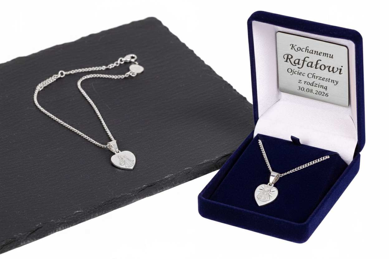Każdy medalik umieszczony jest w ozdobnym pudełku prezentowym z możliwością wykonania dedykacji. Grawer laserowy na metalowej tabliczce lub nadruk Ink-Jet na wieku pudełka pozwalają dodać kilka słów od serca – modlitwę, cytat lub imię – tworząc niepowtarzalną pamiątkę duchową.