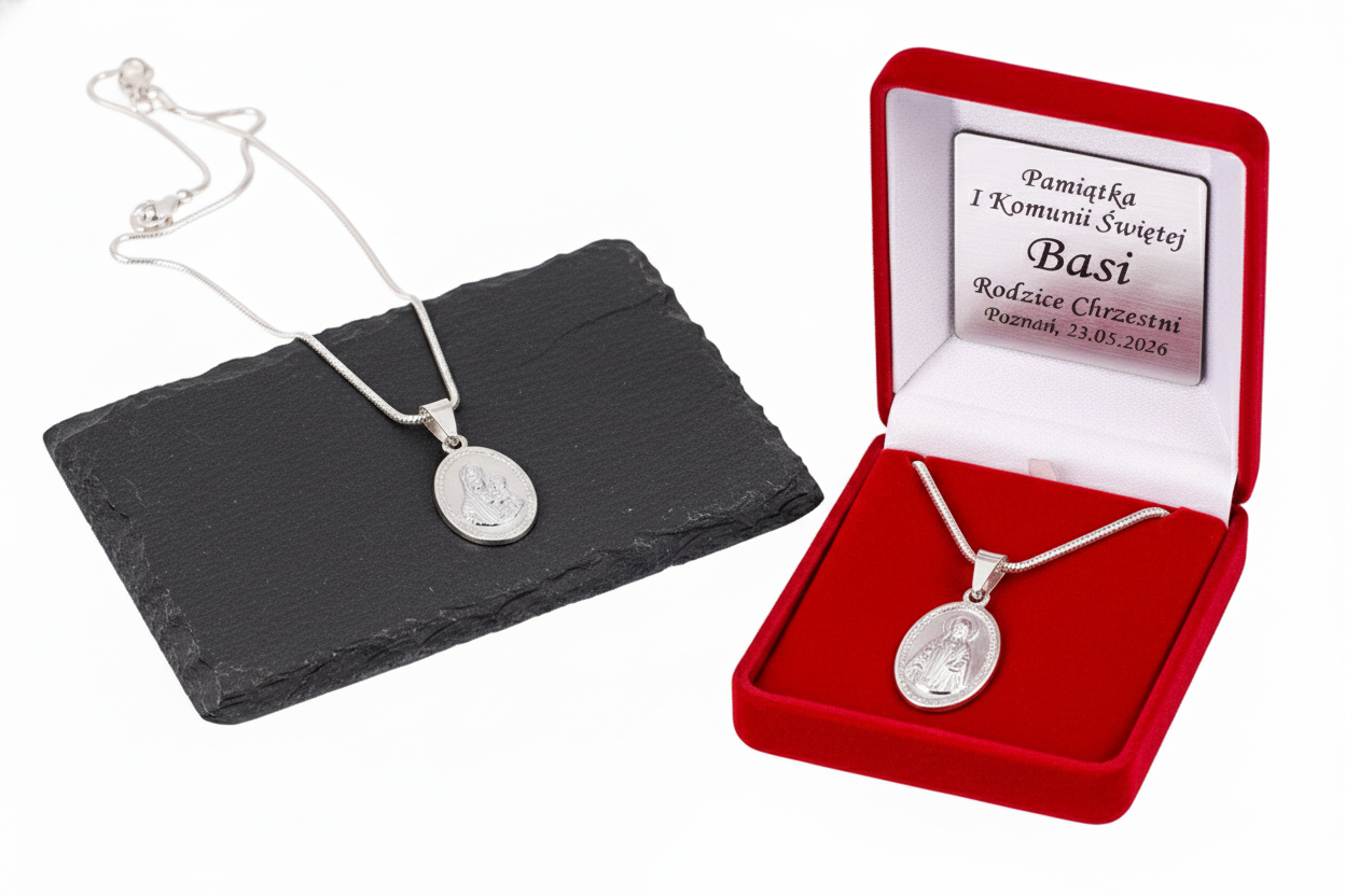 Każdy medalik umieszczony jest w eleganckim pudełku z możliwością wykonania indywidualnej dedykacji – w formie graweru laserowego na metalowej tabliczce wewnątrz opakowania lub pełnokolorowego nadruku Ink-Jet bezpośrednio na wieku pudełka. Wystarczy kilka słów od serca – modlitwa, imię, data, błogosławieństwo – by pamiątka nabrała osobistego i duchowego znaczenia.